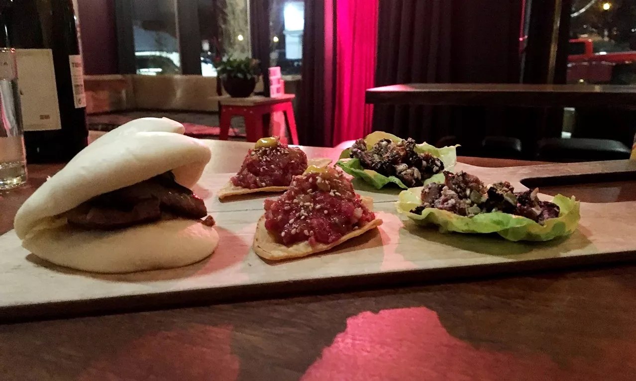 We split the four small plates into two tostadas and two steamed buns, and threw in two lettuce wraps ($7; outside of happy hour, each set of two will run you $9 to $14). We waited, and waited, for our drinks to come, but the baby-faced bartender was too preoccupied taking shots with the women seated in front of him to prepare our cocktails. Our server, however, arrived with the wine, accompanied by one hovering drunk customer from the bar. Meanwhile, another drunk man took the opportunity to get closer to the woman who appeared to be the first drunk man’s girlfriend.
