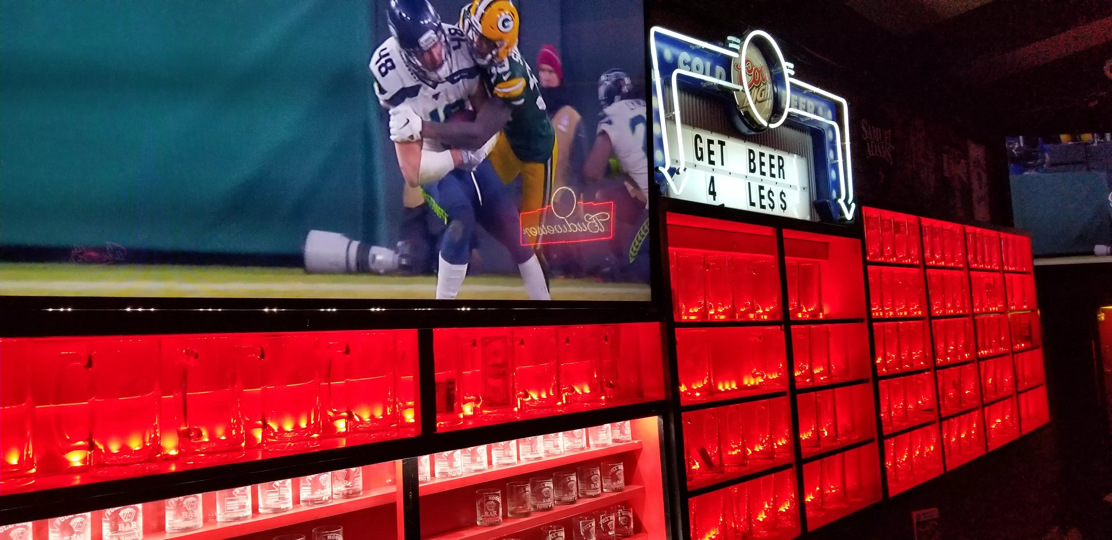 One thing we didn’t do was join the mug club, since it’s currently closed to new members. But existing mug clubbers get $3 beers in their own 32-ounce glasses with their names engraved on them. There’s a similar option with shot glasses, with $5 shots in a personal shot glass. The club is so popular that there aren’t any spots for newcomers, in part because the display shelves, back-lit in red lights along one wall, are completely full. Here and there, the mugs have a few dollars tucked into them, a “buy a friend a drink” sort of situation where patrons leave a little surprise for their friends to find later. After all, you never know what you’re going to get at the Full House Bar and Grill.