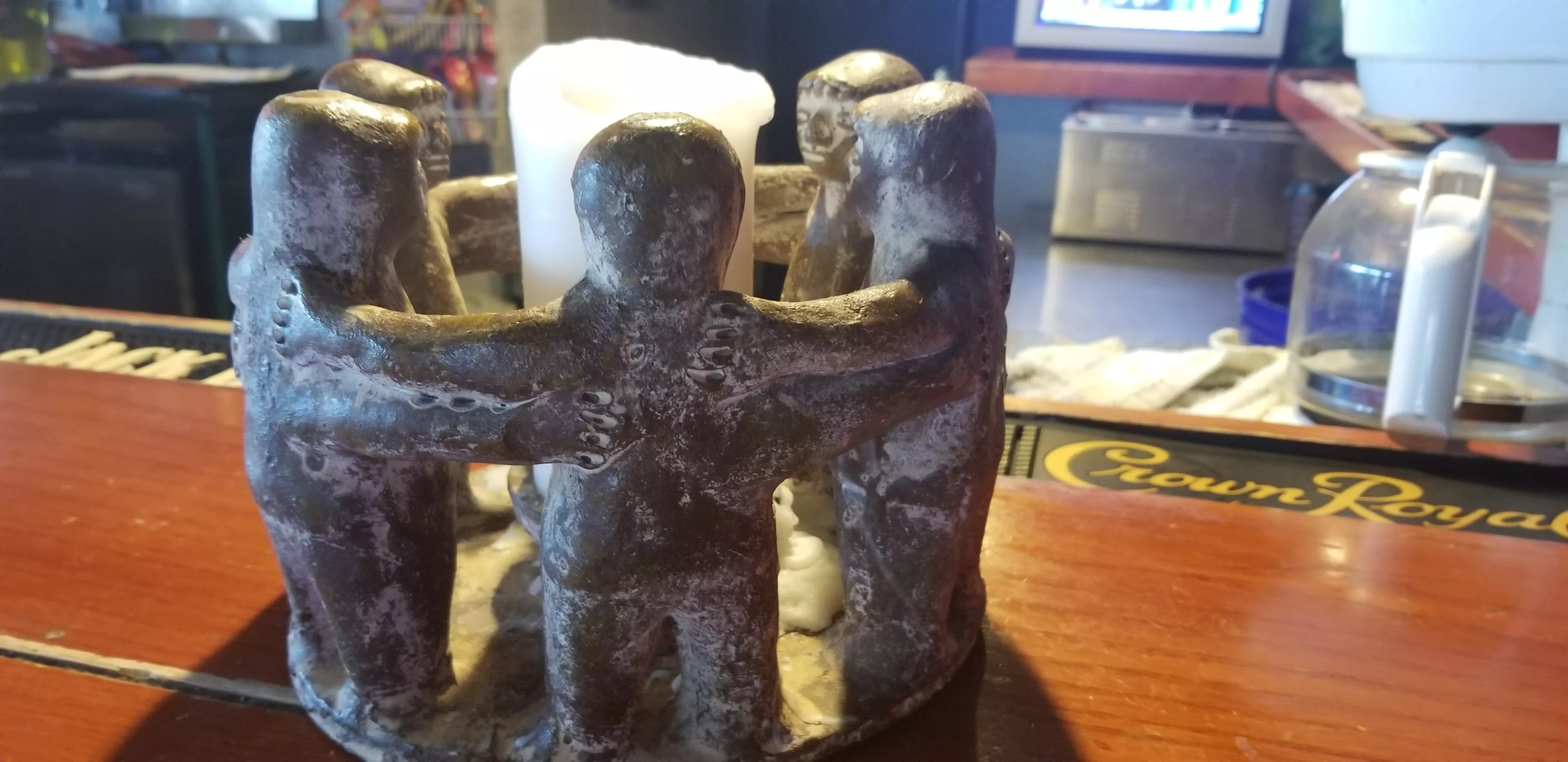 We snagged a few rounds of Buds and went about catching up on life at the bar. Periodically, the place would break out in a cacophony of good-natured but rather loud yelling. My friend joked that we needed to practice using our “outside voices” so we could hear each other, despite being seated side by side at the bar. For reasons too convoluted to go into here, my friend had brought me a gift of sorts – a clay candle holder depicting several figures embracing in a circle. The bartenders pointed out that the figures looked like sloths, (which they did) and we all started joking and yelling about the “Sloth Unity Candle.”