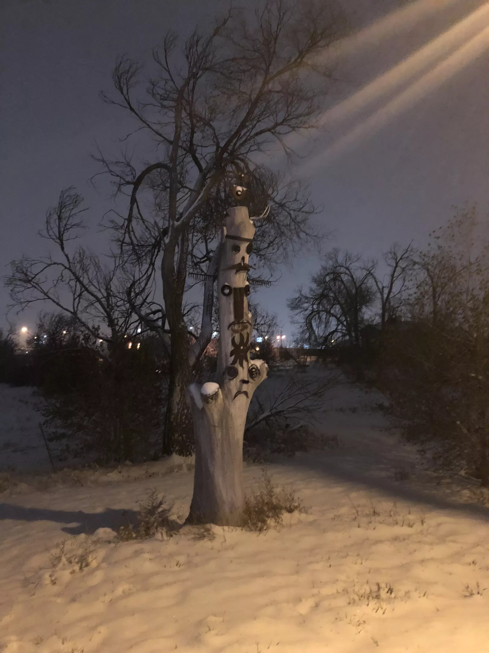 The bar is spacious and bright, with white walls and dark wood on the ceilings. Everything looks clean and new, without a lot of clutter. Janelle’s cousin painted a mural with the Drunken Monkeys logo on the wall, and also accidentally left a massive airbrushed painting of a sea turtle at the bar, which now adorns the wall by the ping-pong table (at least until he remembers to come back to get it). Outside the bar, next to the parking lot, there is more unusual folk art: a tree that resembles a totem pole, with faces and other decorations made from scrap metal instead of being carved into the wood, the name of its creator lost in time.