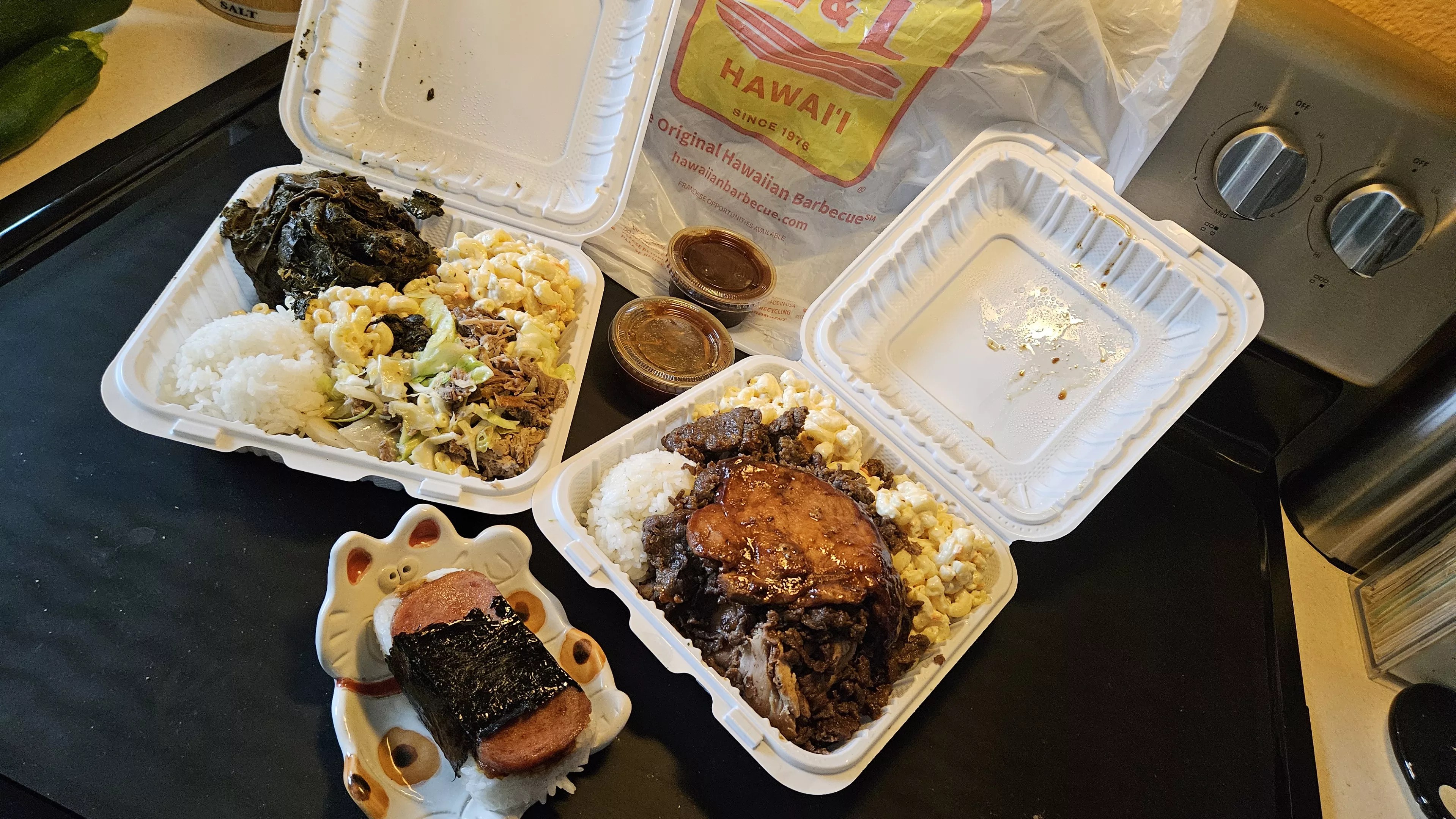 A Hawaiian plate lunch feast from L&L Hawaiian BBQ, with a Spam musubi added.