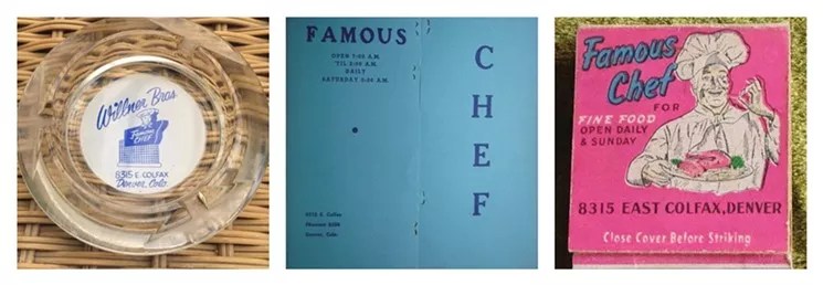 The structure was built in 1950 to serve as the home of the Famous Chef restaurant, operated by the Willner brothers: Harry, Jack and Milton. A 2016 post from the East Colfax Neighborhood Association shows assorted restaurant memorabilia, including an ashtray, the outside of a dinner menu and a matchbook cover.