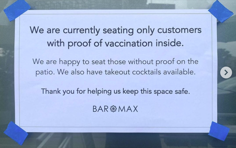 Cafe Aion in Boulder made headlines this past weekend when chef/owner Dakota Soifer announced that he would be implementing a vaccine requirement for anyone dining indoors in the near future. Back in April, Bar Max, at 2412 East Colfax Avenue, became the first eatery in the state to adopt a proof of vaccine when it reopened for indoor dining.