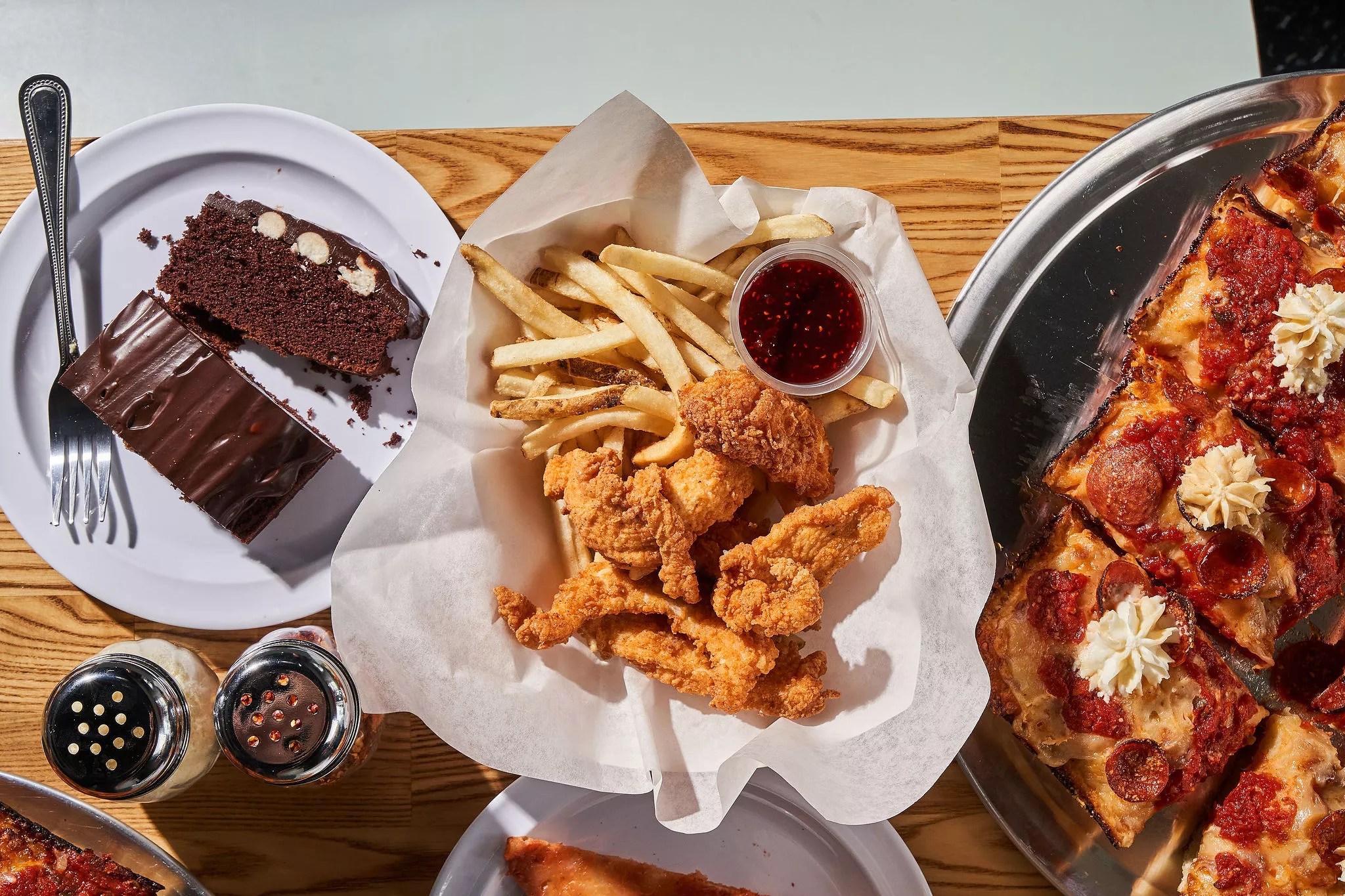 Go to Dough Counter for the pizza, but don’t skip the tenders, fries and cake.