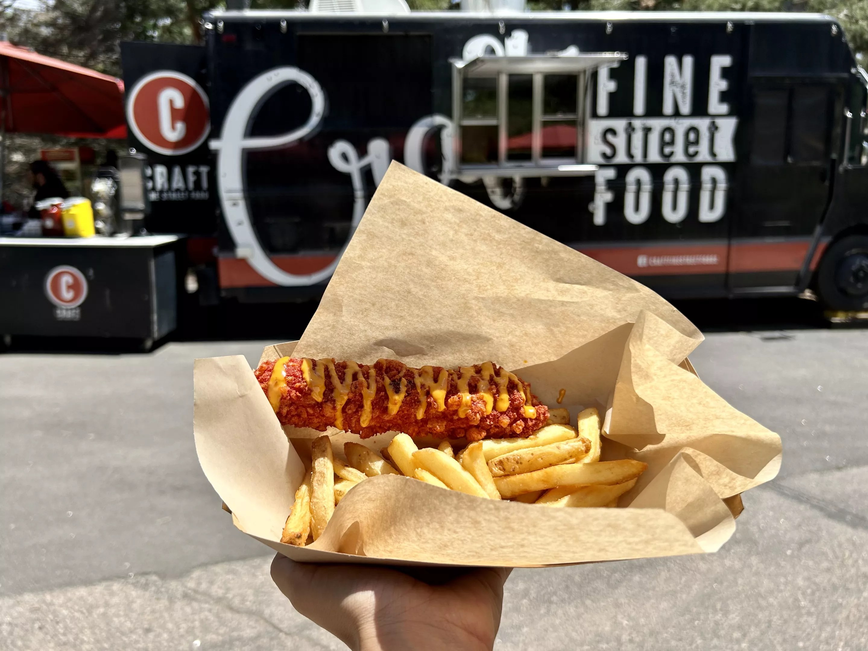 Other options at Craft Fine Street Foods include the Crispy Rice Dog and the Flaming Hot Dog, which is  half beef, half mozzarella cheese, rolled in Flamin’ Hot Cheetos and drizzled with spicy mayo.