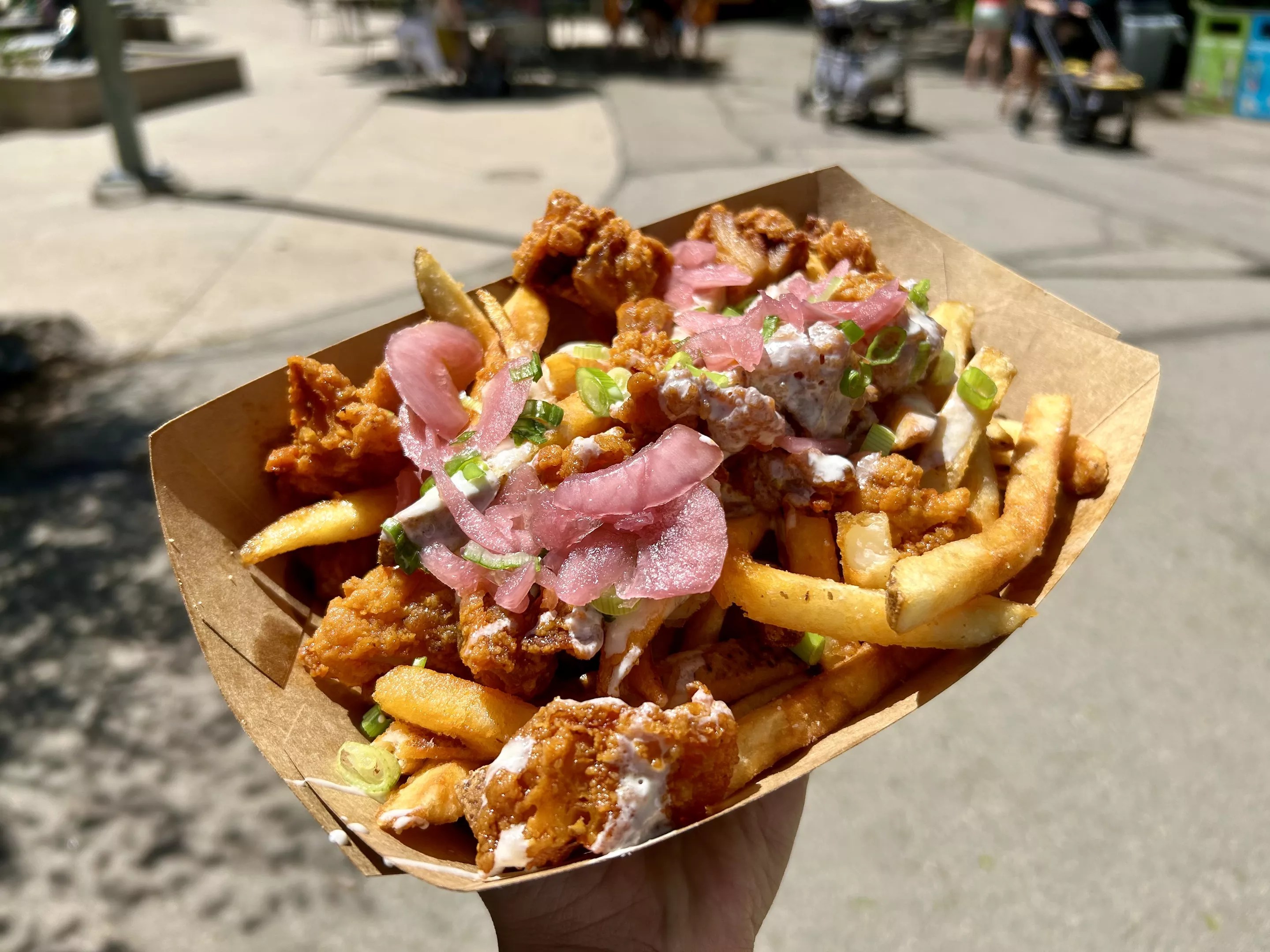 The mobile food concept specializes in hot chicken, served in the form of its top seller – garlic fries loaded with crispy chicken nuggets, white queso, green onion and pickled shallots – and in towering sandwiches with slaw and charred-onion ranch.