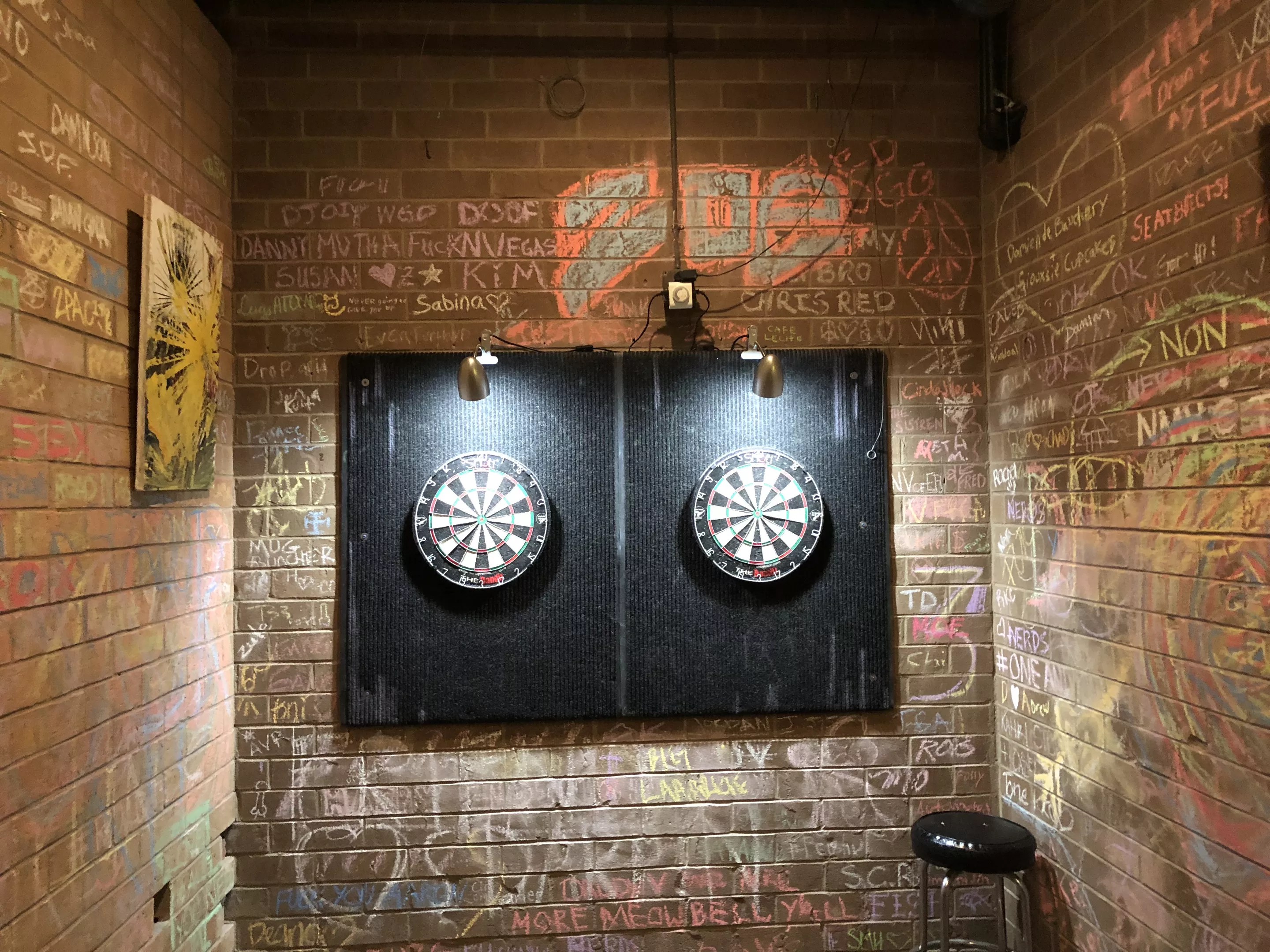 A secret dart room full of chalk graffiti art is ready for competitors and artists at Tennyson’s Tap.