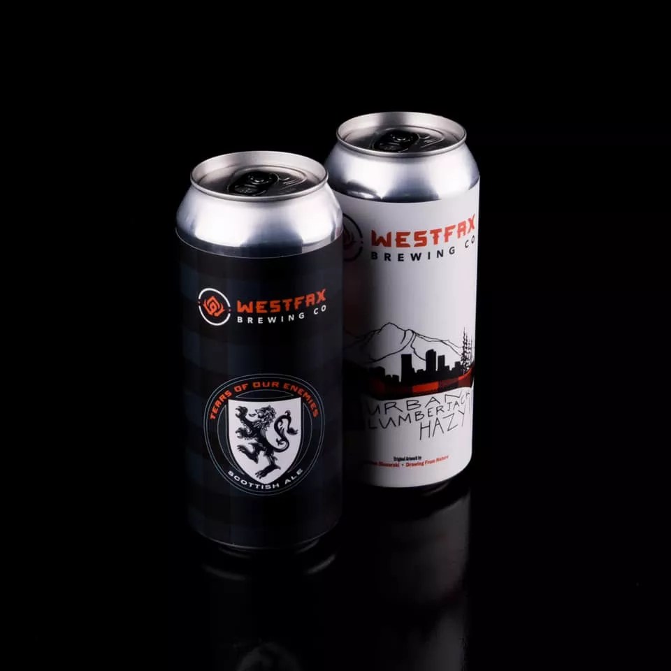 Westfax Brewing has fresh sixteen-ounce four-packs of two flagship beers, Urban Lumberjack Hazy IPA and Tears of Our Enemies Scottish Ale. The first was brewed with six hop varieties. The second is a light brown Scottish ale “with aromas of subtle fruit combined with a toasty malt character followed by flavors of caramelized sugar and toasted bread and finished with a pleasant warmth,” the brewery says.