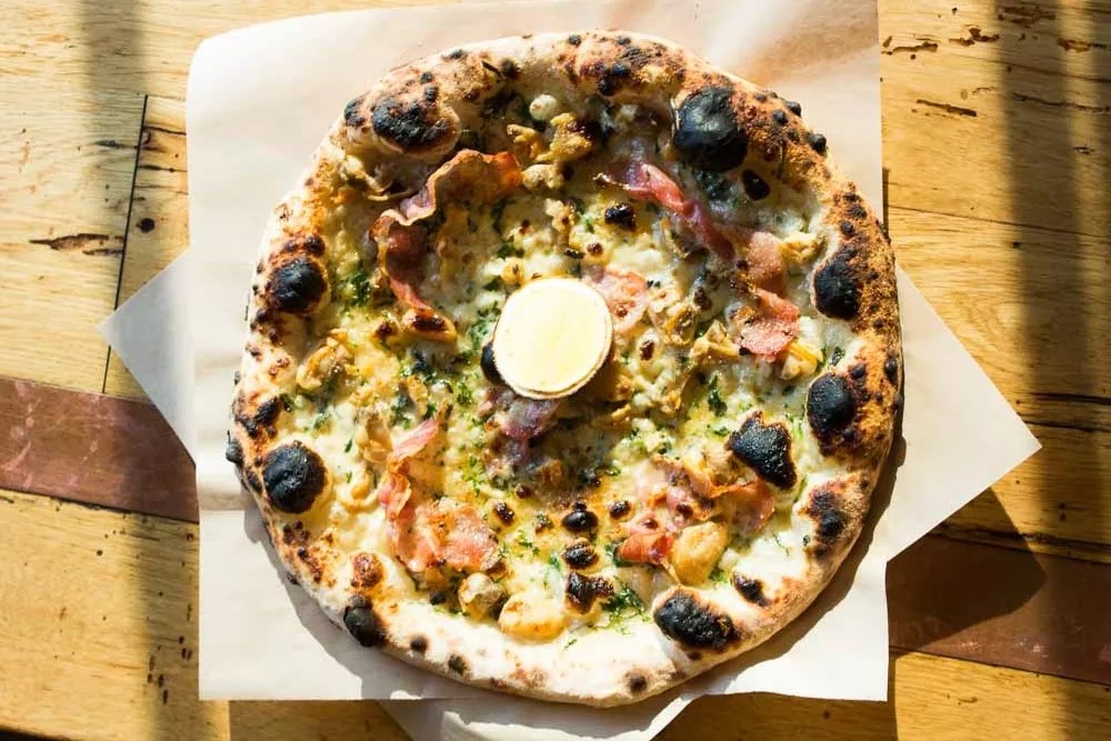 Clams, pancetta and roasted garlic top this pie from Cart-Driver.