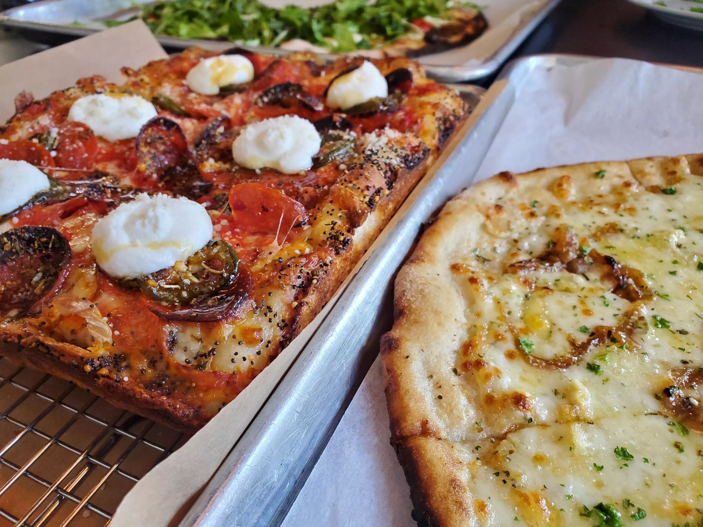 There was a lot of pizza consumed over the past several weeks as we worked on our ultimate guide to the best pizza in Denver. Last year, White Pie in Uptown was our Best of Denver pick for Best Pizzeria, and we recently did a deep dive into what makes its wood-fired New Haven-inspired pies so good. When we visited in January, the Fromage a Trois, with roasted garlic crème fraîche, Brie, mozzarella, pecorino and carmelized onions, remained a favorite, but we were also impressed with a newer addition to the menu – thicker, rectangular Sicilian-style pizzas.