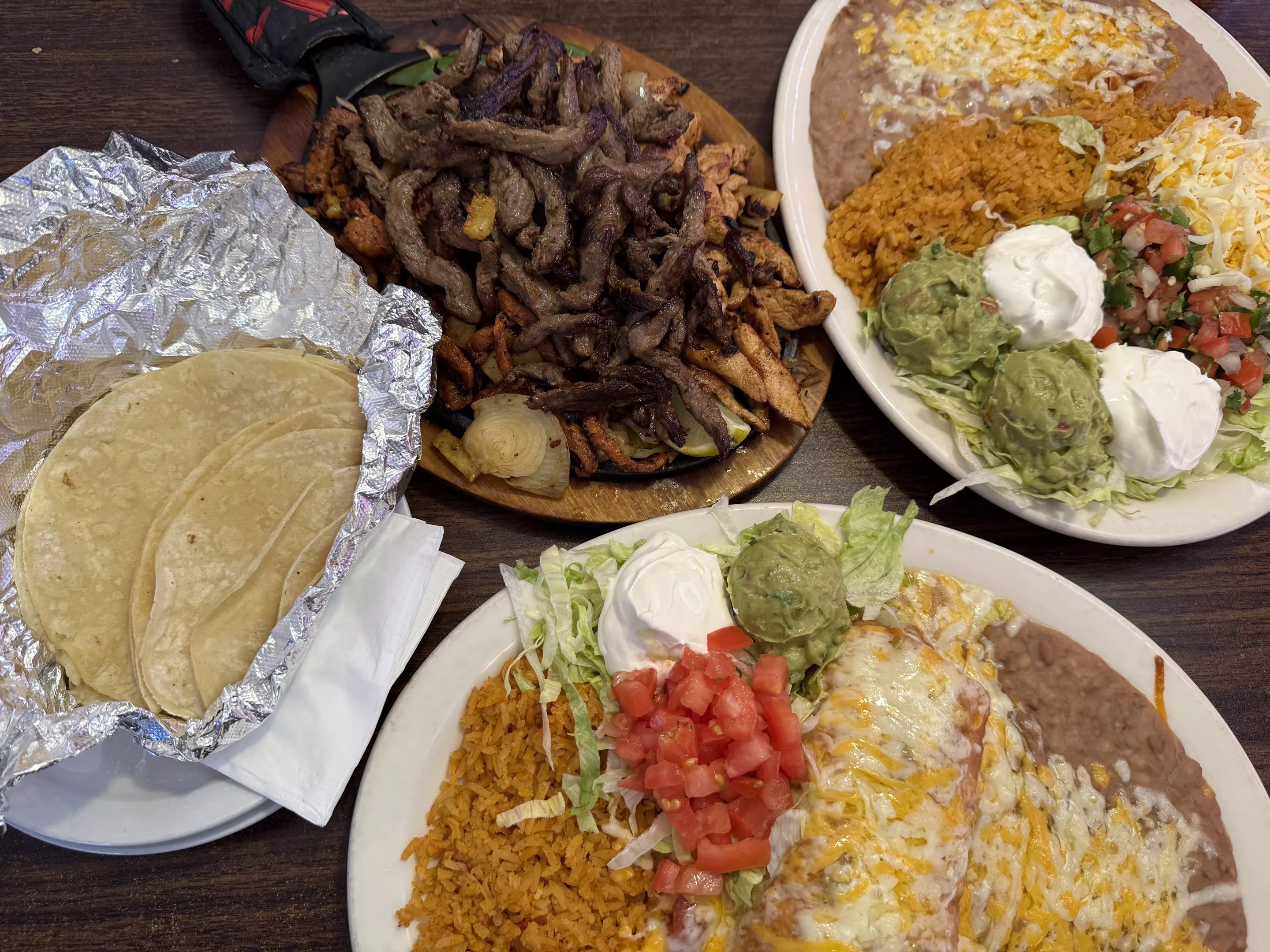 Each order comes with plenty of tortillas (choice of corn or flour) and a heaping plate of accoutrements: tomatoes, cheese, sour cream, guacamole and pico de gallo, served with a smoky paprika Spanish rice and refried beans