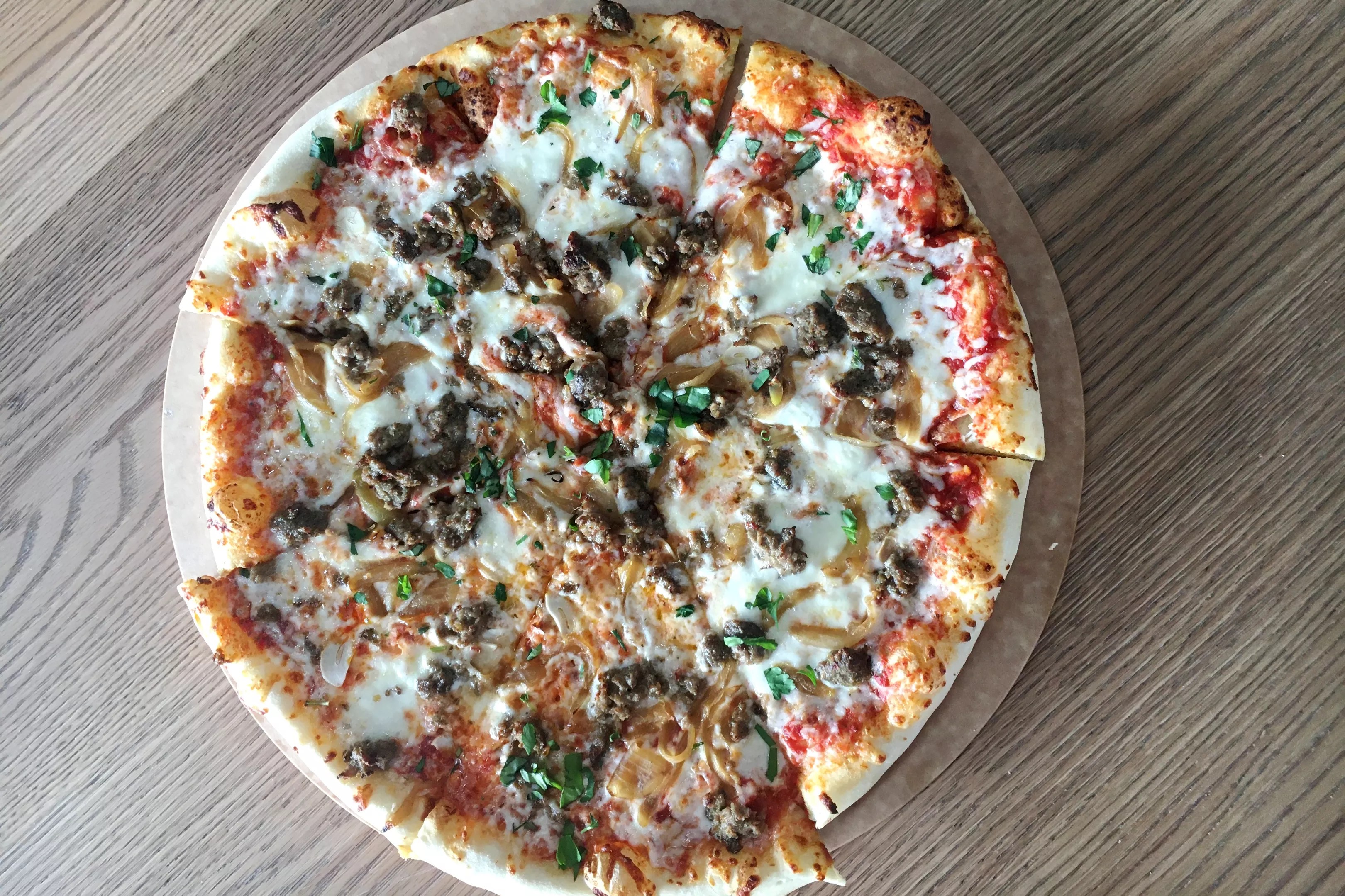 Crumbled meatball, caramelized onion and garlic top one of the new pies.