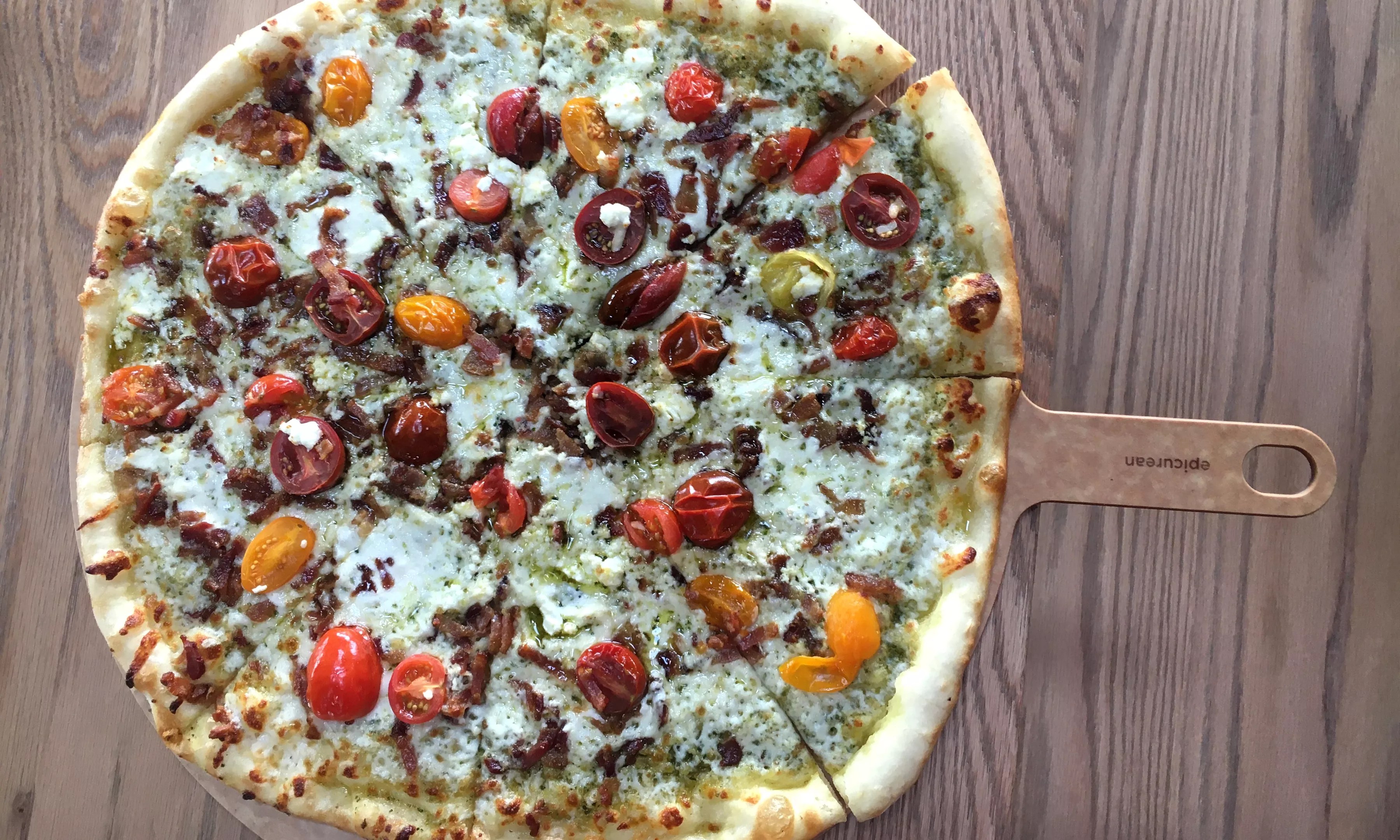 Pesto pizza with bacon and tomatoes.