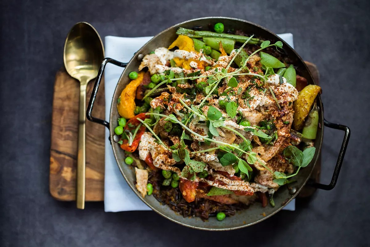 El Five‘s Valencian paella: rabbit confit, smoked sausage and wild rice.
