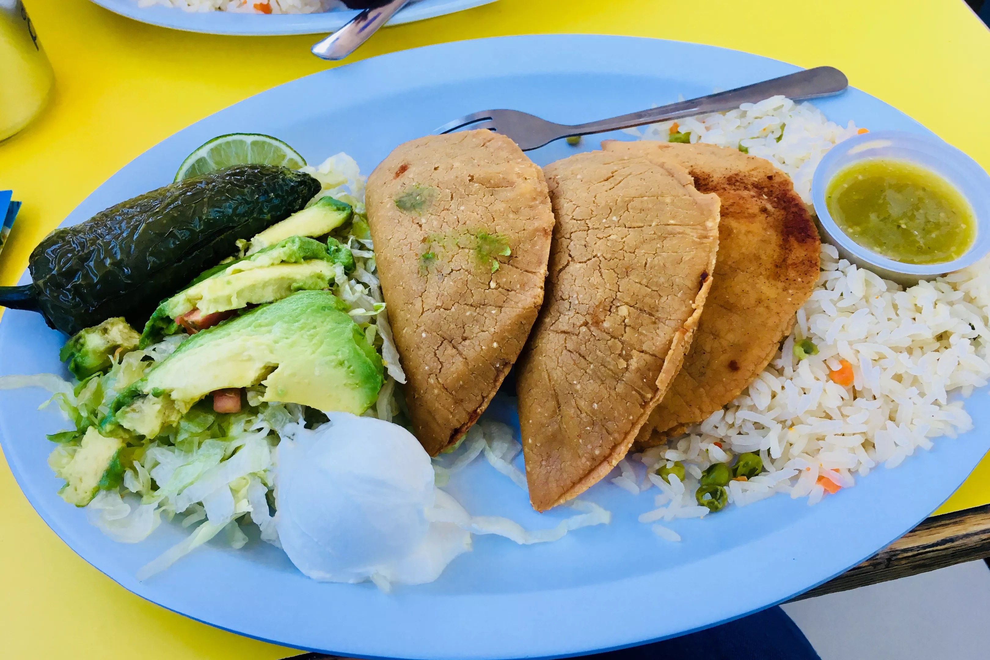 The empanadas weren’t highlighted as a favorite, but I decided to give them a go. They’re offered with shrimp or tuna (atún) filling; I tried them both on my platter of three ($11.50), which came with the same salad and rice that accompanied my camarones rellenos. The tuna, flaked and brownish, looked and tasted like it was from a can, resembling tuna salad without the mayonnaise but with flecks of cilantro, tomato and carrot. It was dry but well-seasoned, though the dryness was quickly remedied with a dunk in salsa verde, which accompanies avocado and a generous dollop of sour cream on the plate.