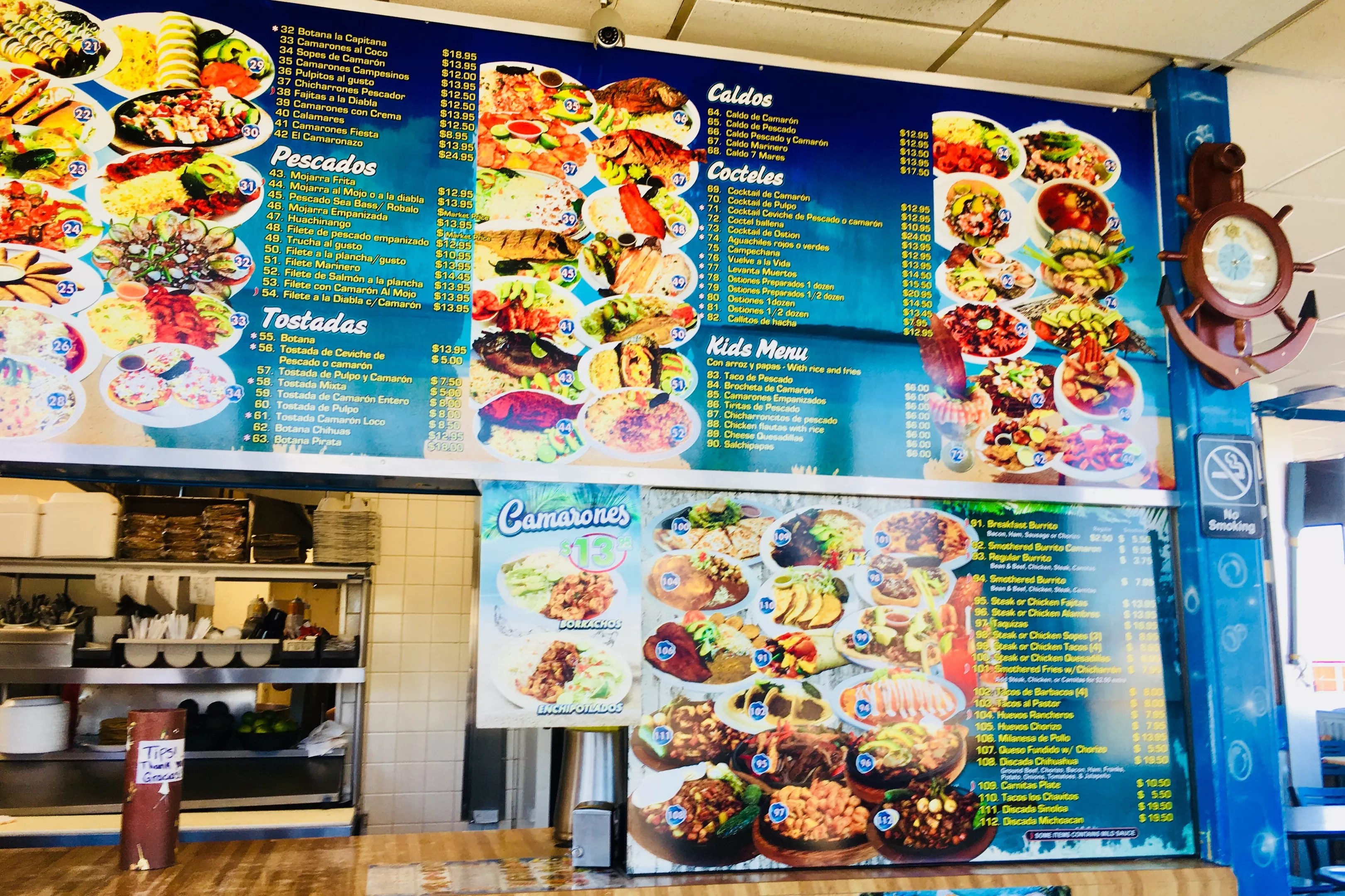 Three steps beyond the entrance hangs an enormous, overwhelming menu cascading with seafood and other Mexican specialties. With 113 dishes offered, even the most decisive customers will pause longer than usual, if for no other reason than to take in the photographs of platters mounded with shrimp, whole fish, bright produce and vivid sauces. Most of it’s in Spanish, but there’s also a paper menu in English. The pressure’s on, since a cashier standing beneath that colorful roster waits for you to make up your mind. In the likely situation that you’ll need help making your entree choice, the house “Favorite” dishes (which probably means “most popular” here) are marked on the menu in red, but that only narrows it down to about the same number of main dishes you’d see on a typical menu at any other restaurant.