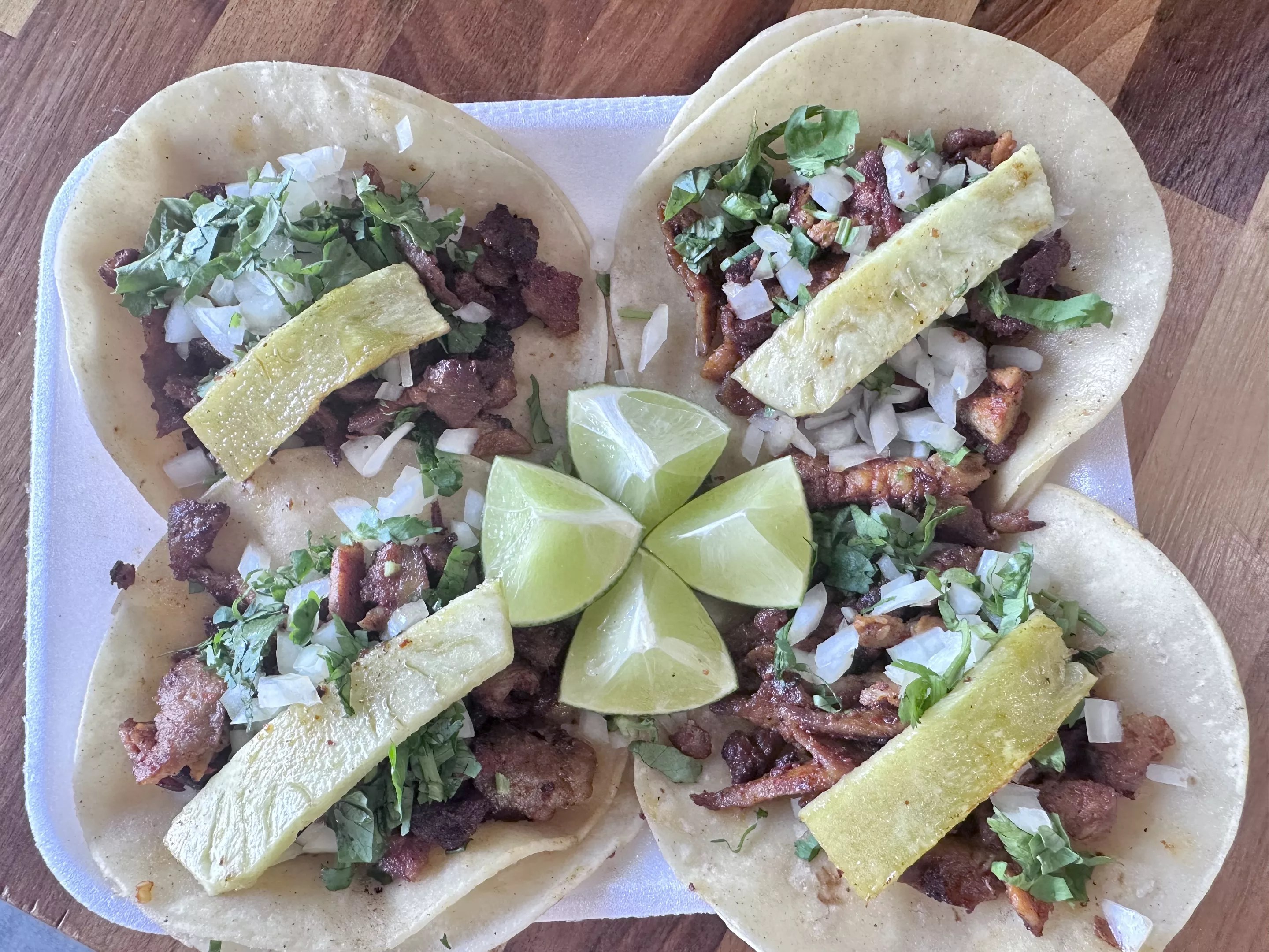 Operating roughly five days a week, Corona rarely posts his schedule. “I just go where I’m supposed to go and I make it happen,” he says. But, with the busy season coming to a close, he plans to adjust for the winter season and focus on selling meats by the pound and take-home taco kits from a semi-permanent spot at Lowe’s on Havana Street.