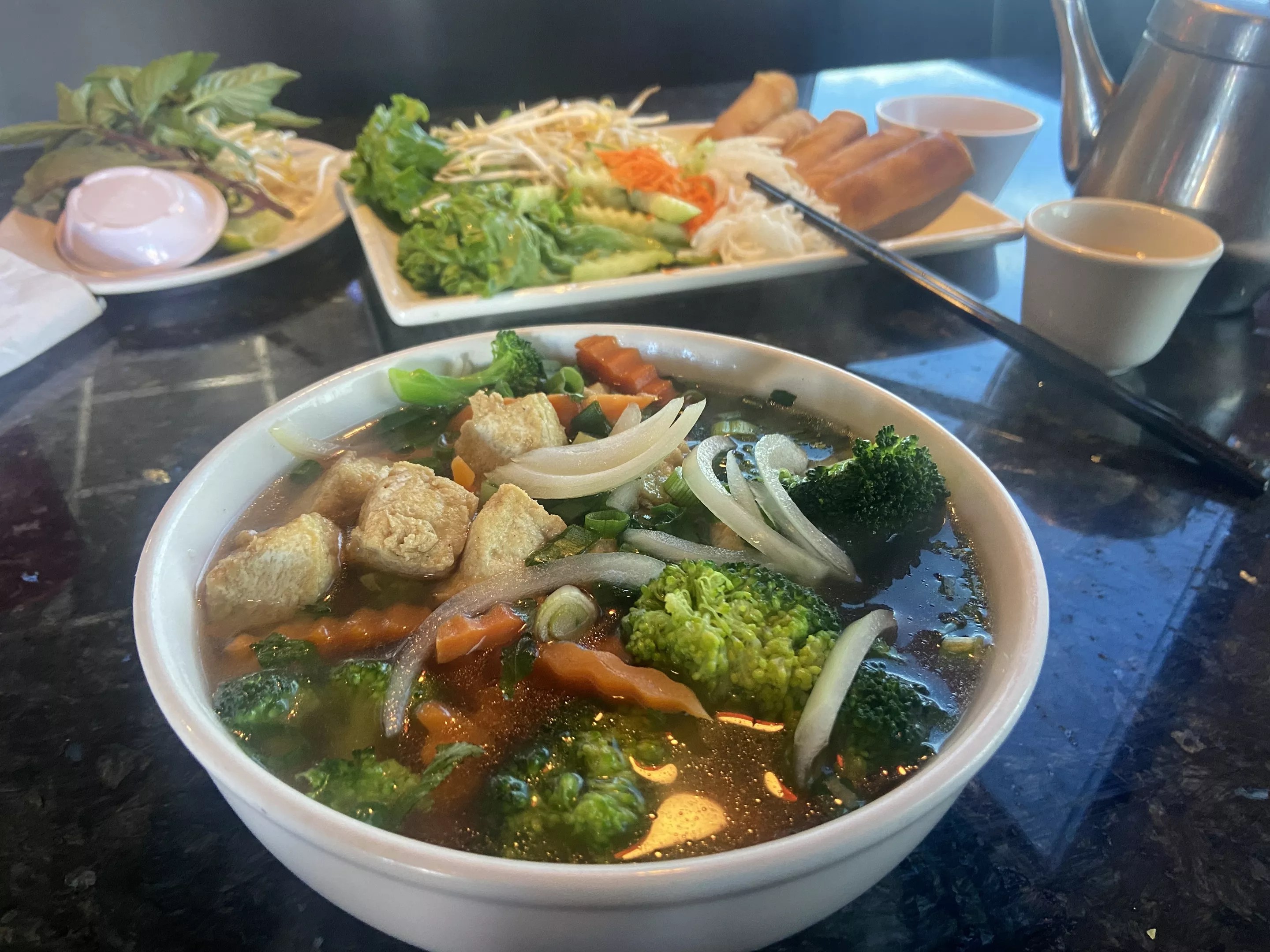What you’re eating: Pho, duh. On my last visit to Pho 555, I ordered veggie egg rolls ($9.25), hot tea ($1.50) and a small veggie and tofu pho ($12.95), which was still a huge portion. The broth was hearty and tangy, accompanied by plenty of bean sprouts, chiles and lime to add myself.