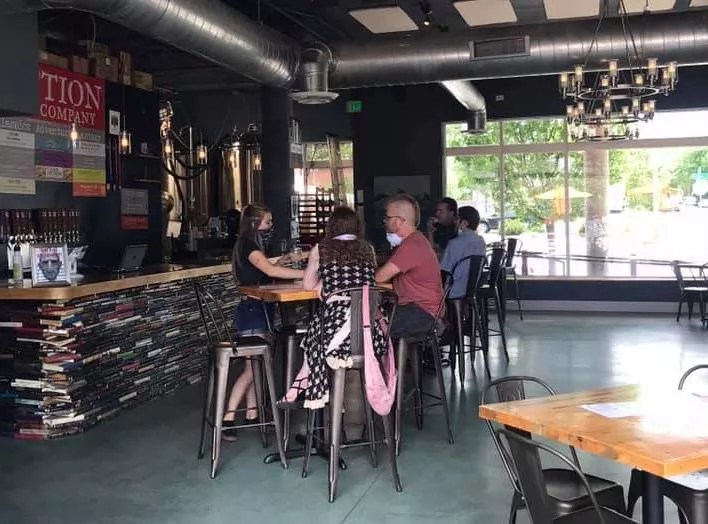 Fiction Beer Company’s bar is made out of old books.