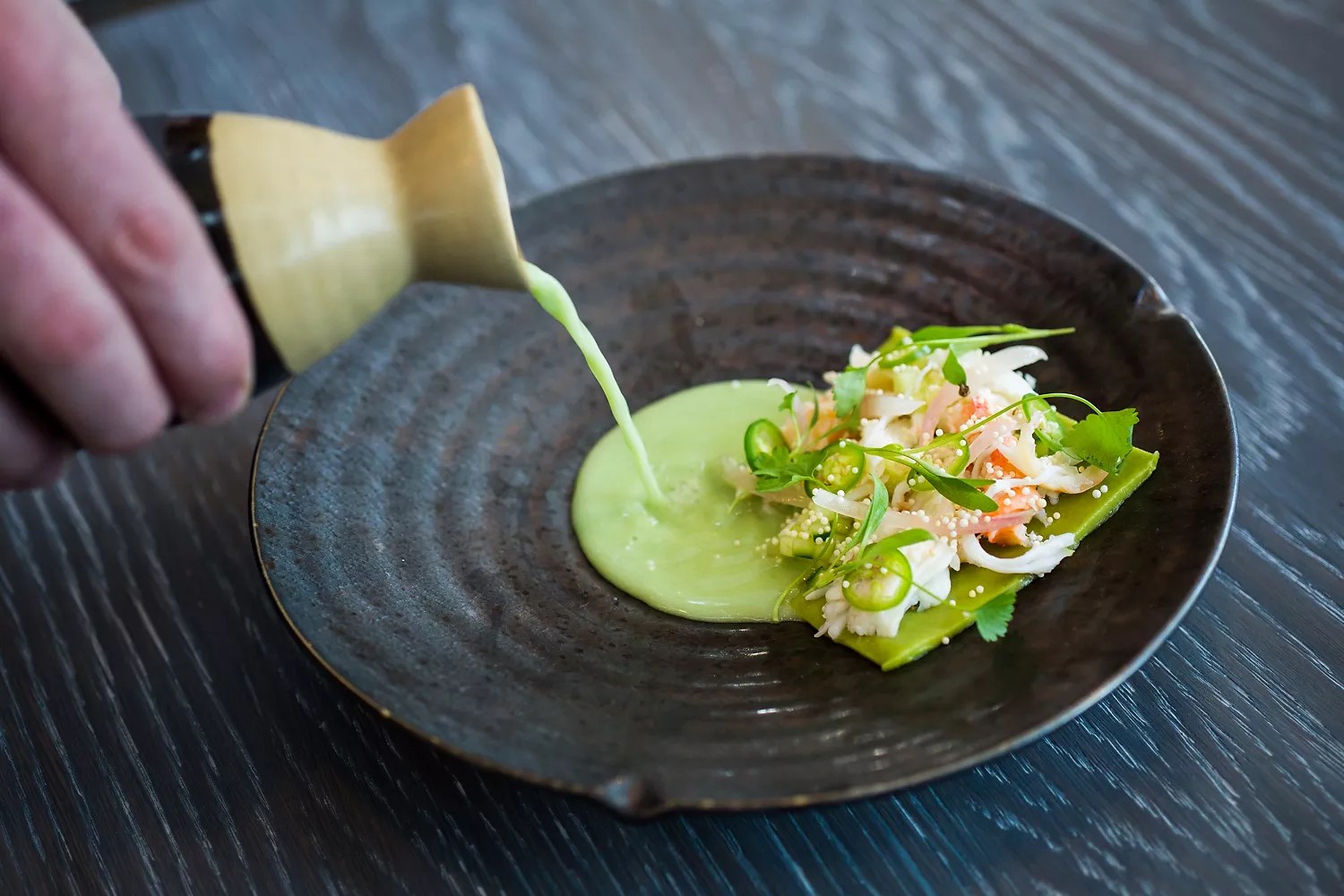 King crab with avocado, pickled shallot, serrano chiles, puffed rice and coconut-chile broth.