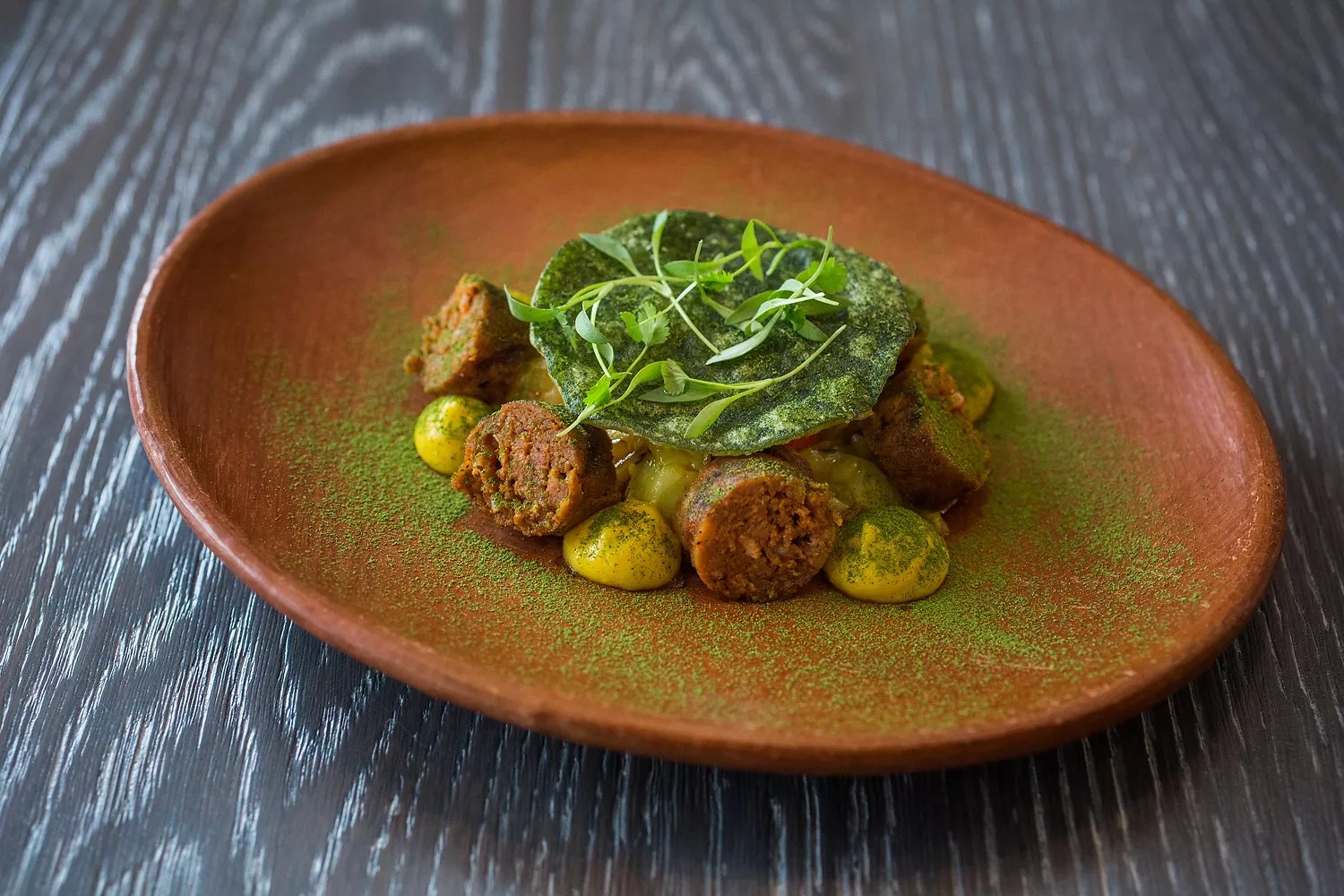 Tostada de hoja santa with shrimp escabeche and Argentinian chorizo.
