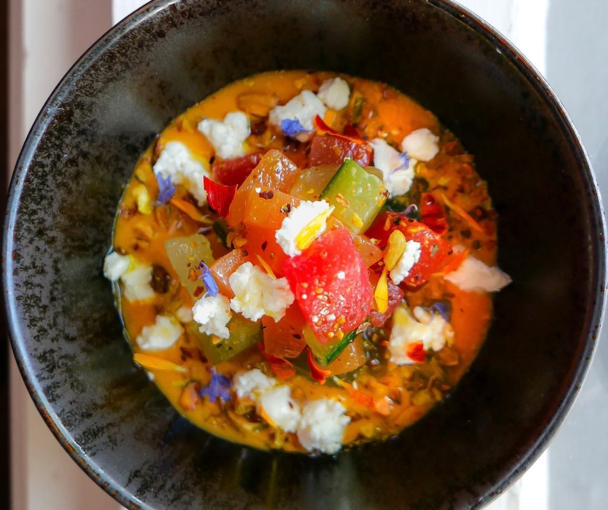 One of Colorado’s most well known (and delicious) summer crops is at its peak right now: Rocky Ford melons. Head to Fruition, at 1313 East Sixth Avenue, where chef Jarred Russell is celebrating the season with a Rocky Ford melon and golden tomato gazpacho with pistachio and mint.