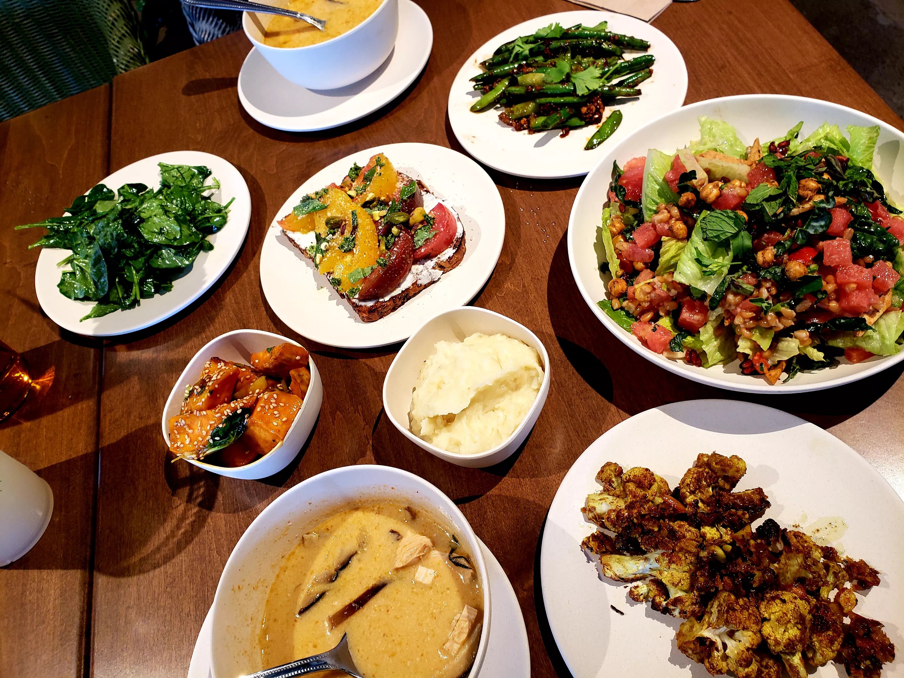 A spread of healthy delights from Thai chicken soup to tomato toast to smashed potatoes to saut