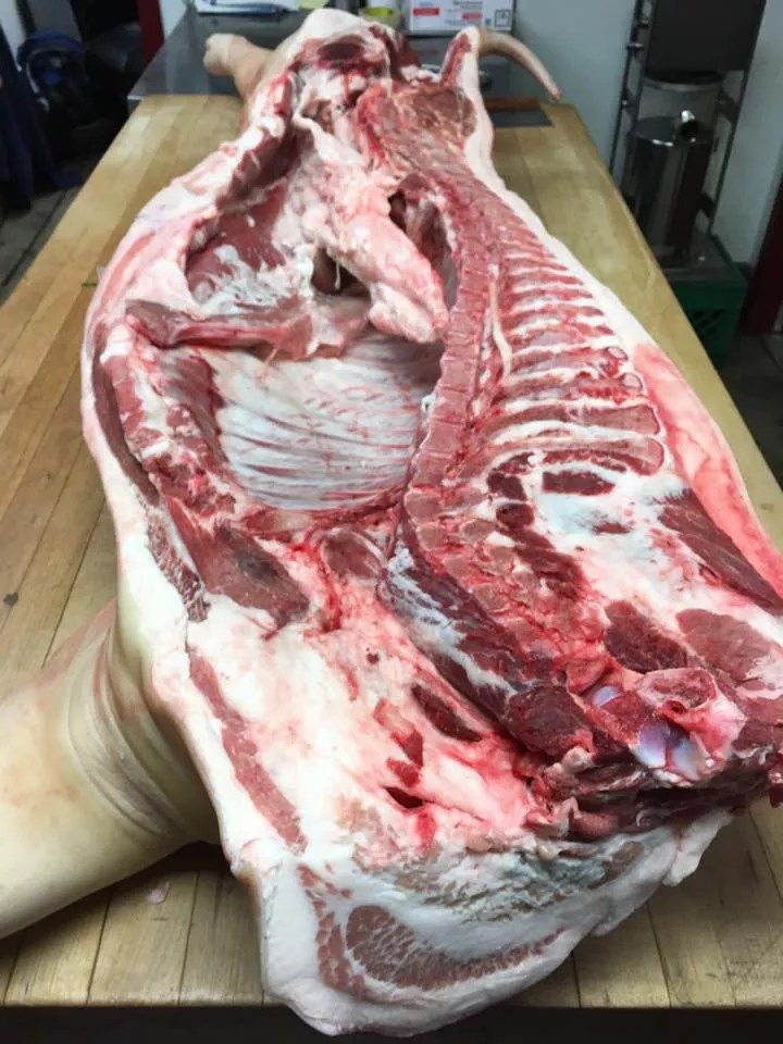 A Cone Ranch Berkshire hog delivered to Il Porcellino.