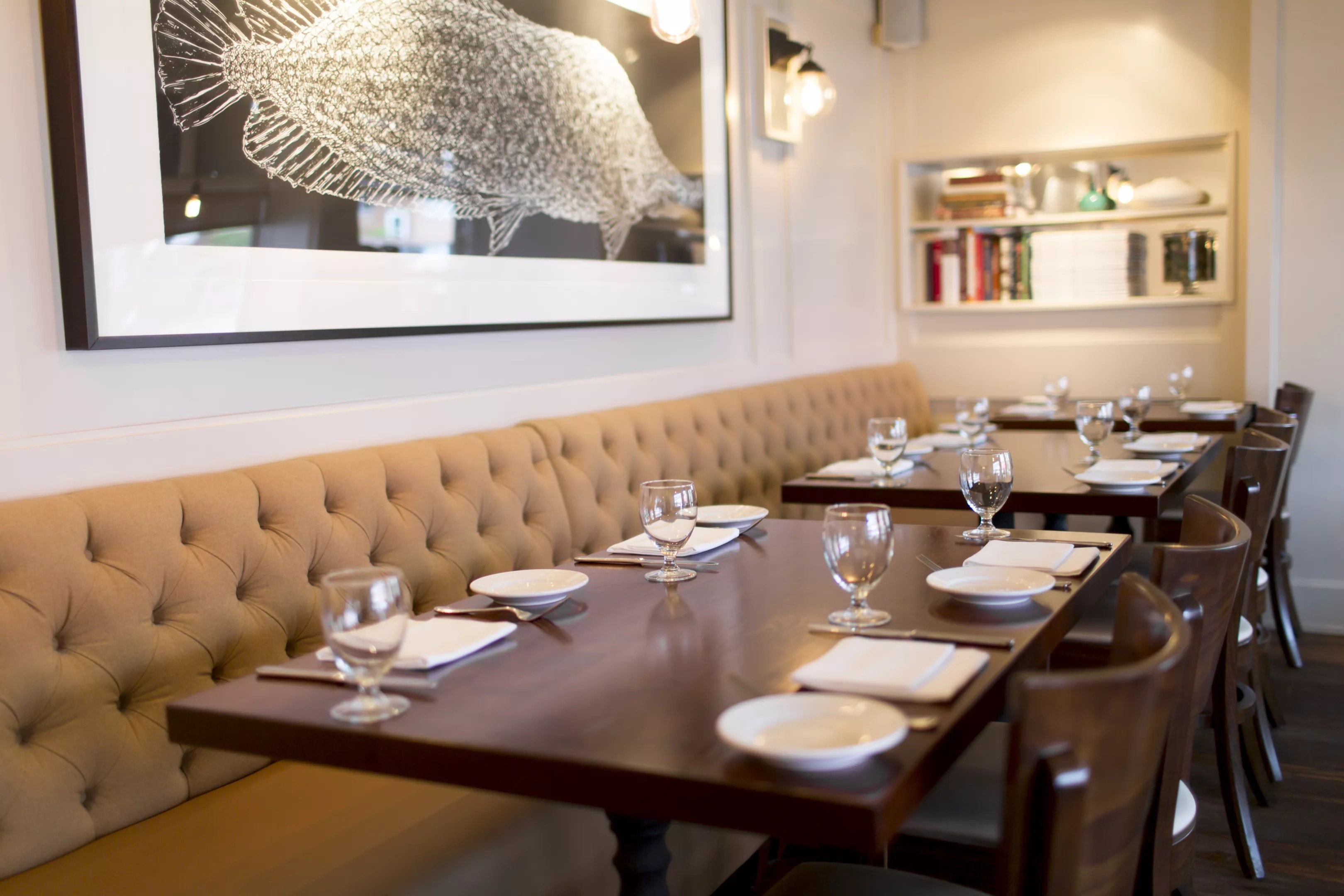 Cozy up on the banquette, which overlooks the foot traffic going by.