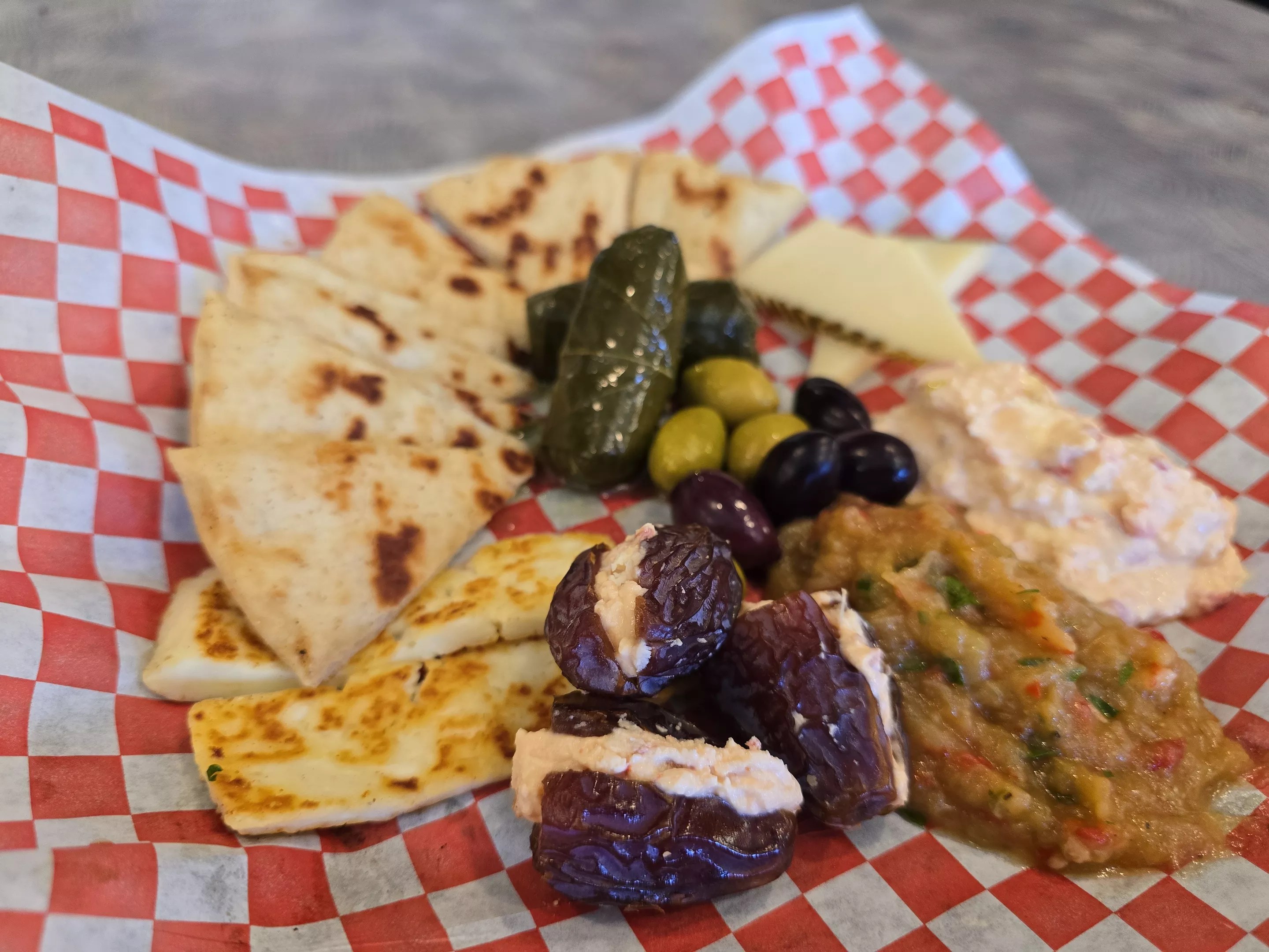 The Mediterranean Grazing Board includes whipped feta-stuffed dates, dolma, grilled haloumi and more.