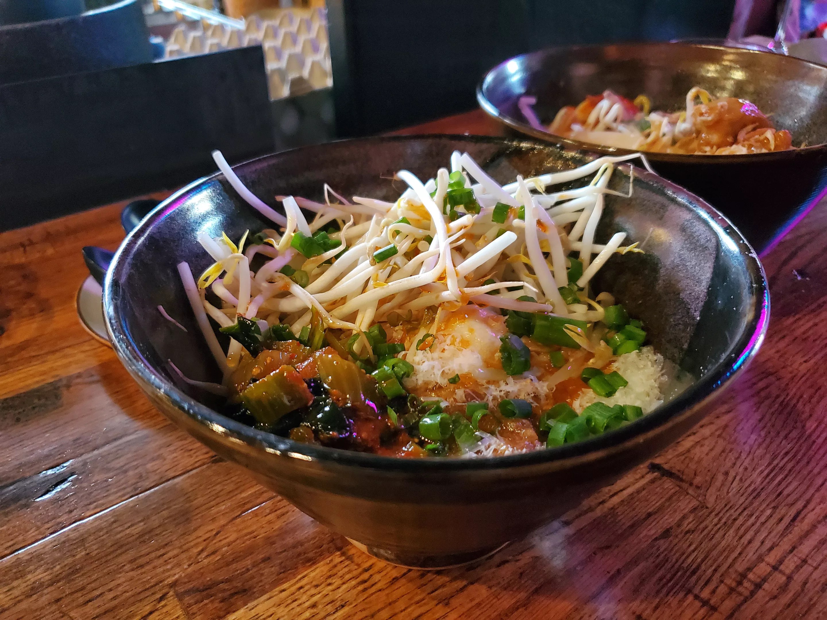 There are seven noodle options ($15-$19) – six traditional ramens and one brothless variety, Kimchi Bolognese (mazeman), which is loaded with noodles and ground pork and beef in a play on red sauce made with gochujang. It’s topped with a soft-boiled egg, green onion, bean sprouts and a shower of pecorino for an umami-packed effect.