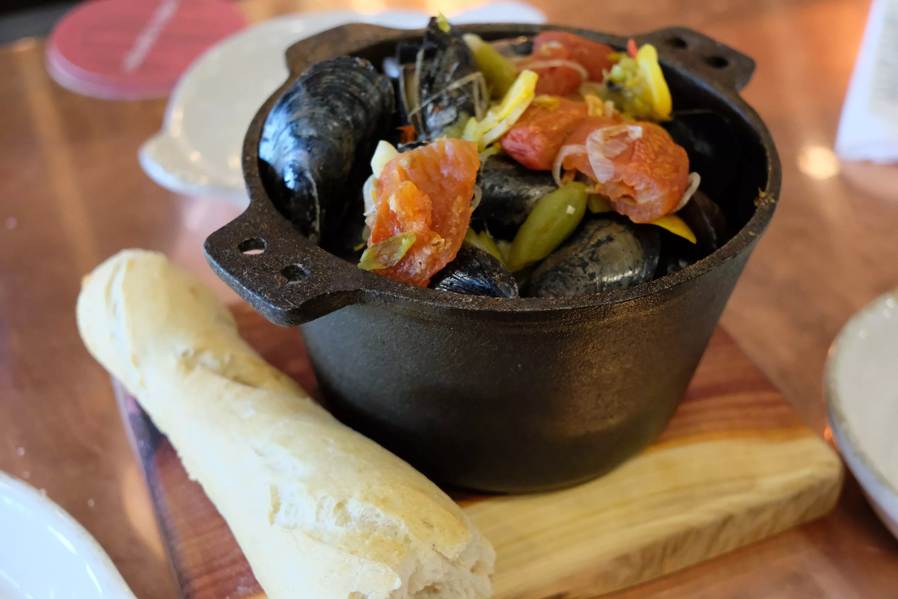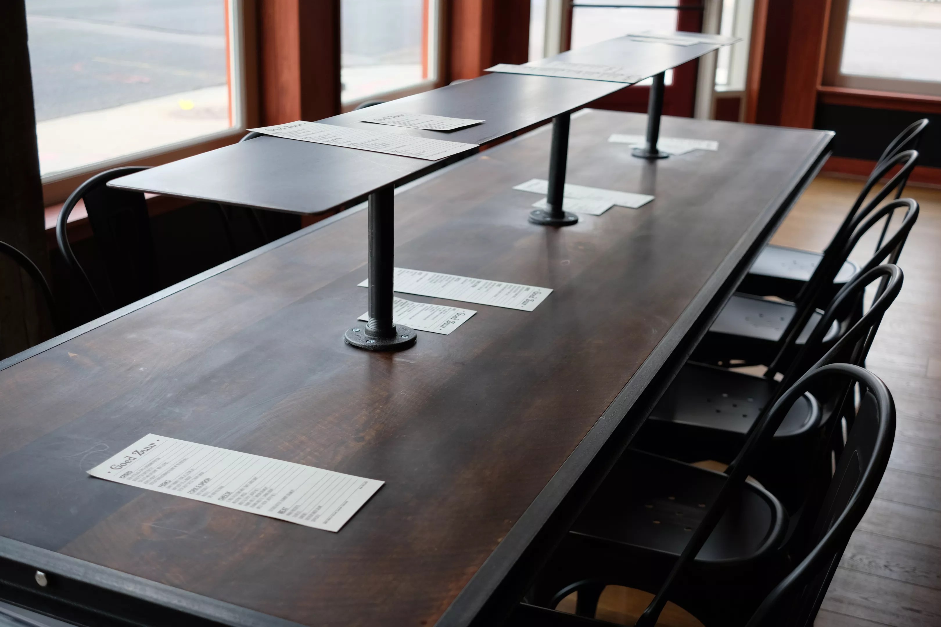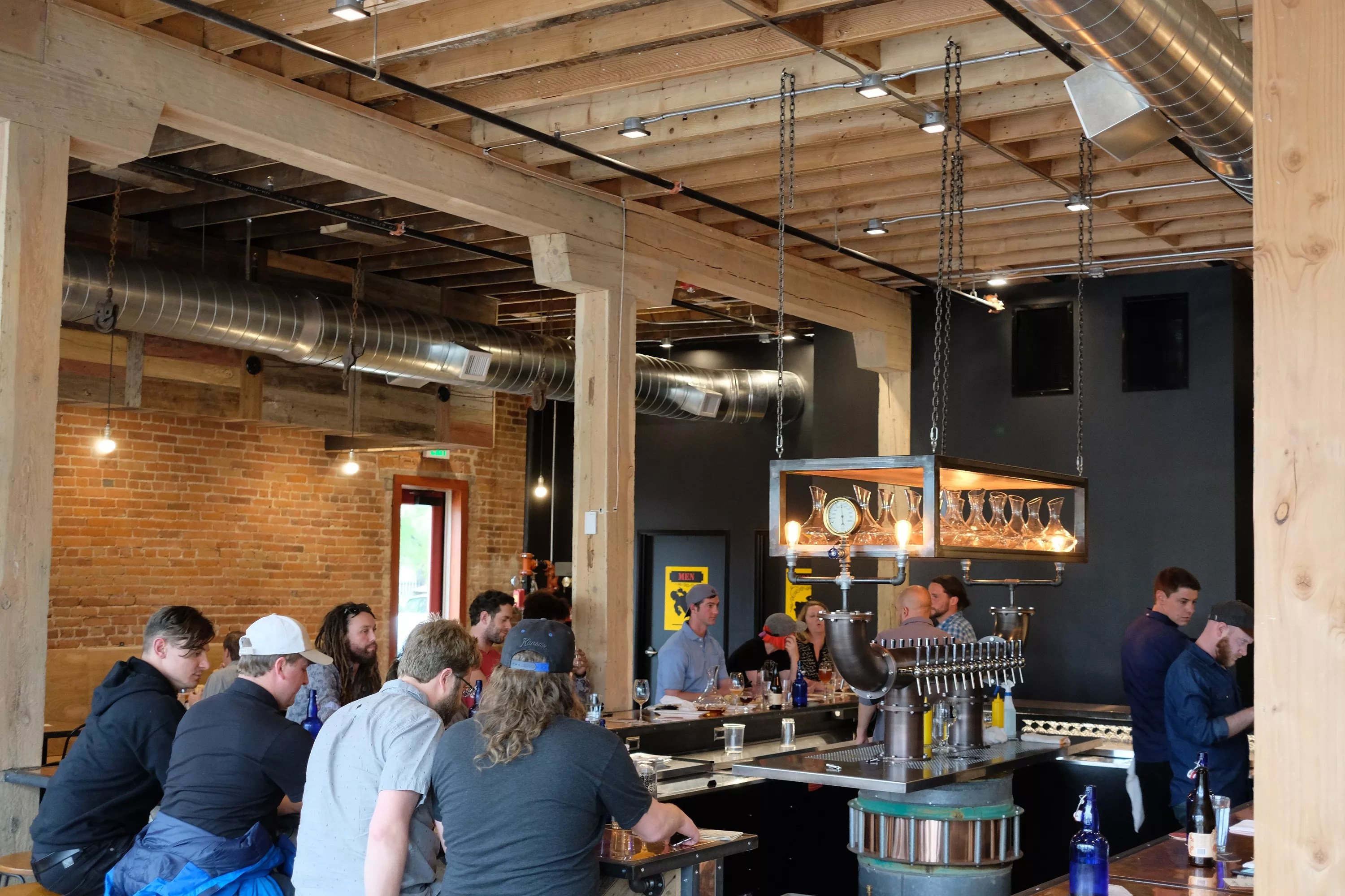Set inside a 120-year-old brick building with a carefully restored 1930s-era mural on the side, Goed Zuur, which means “good acid” in Dutch, boasts an interior look best described as Steampunk meets European chic. Long tables with elevated platforms for meat-and-cheese boards run along one side, while an artsy clock covers an entire wall on the other. In the middle is a copper-topped bar and custom draft tower made of industrial pipe, wood and lightbulbs.