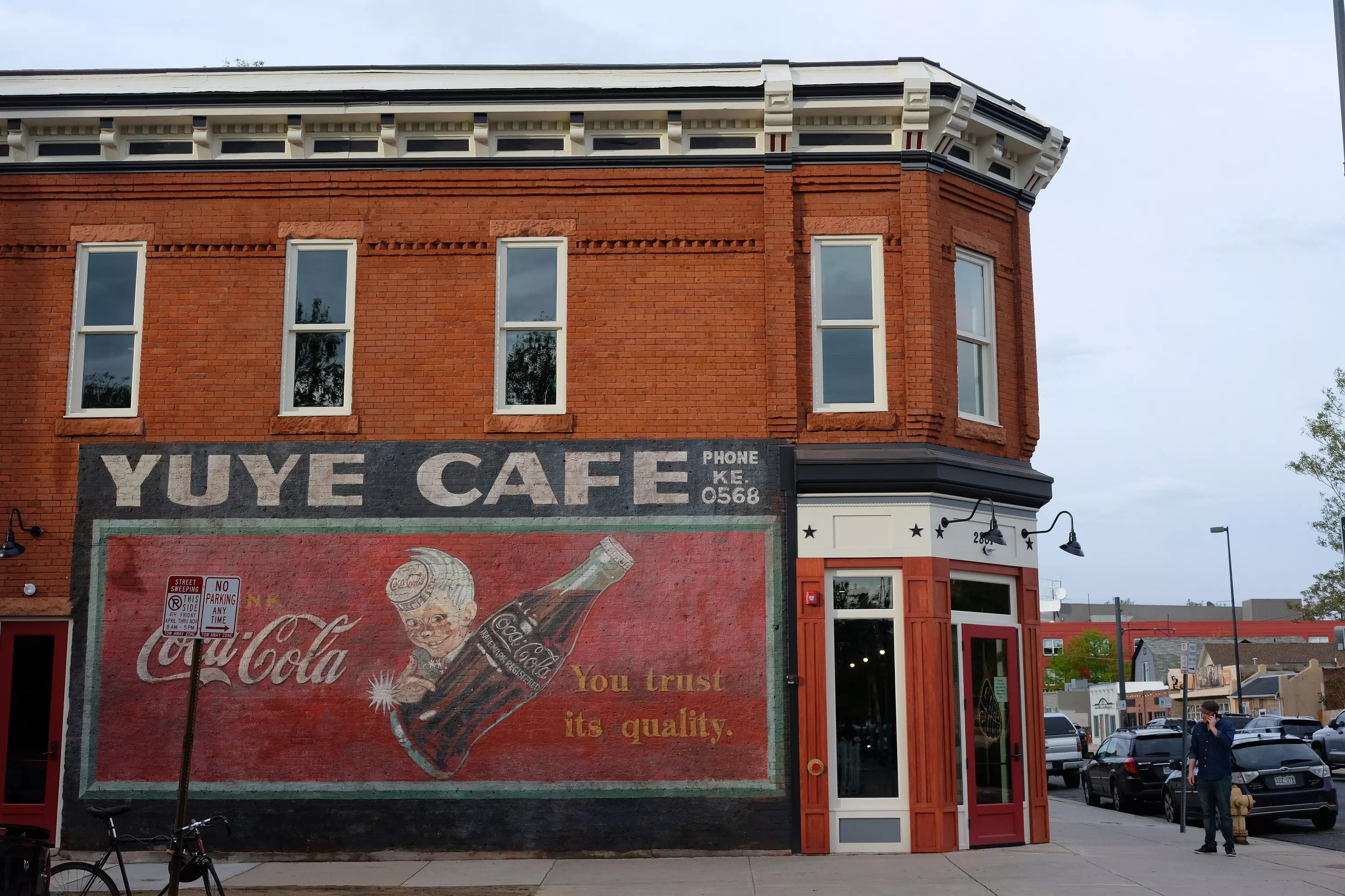 While the building was being renovated in 2015, developer Star Mesa Properties discovered an old mural, or “ghost sign,” as they are called, underneath a beige stucco exterior. In accordance with a city rule for historic buildings, the sign, which advertises the Yuye Cafe and Coca-Cola, was preserved