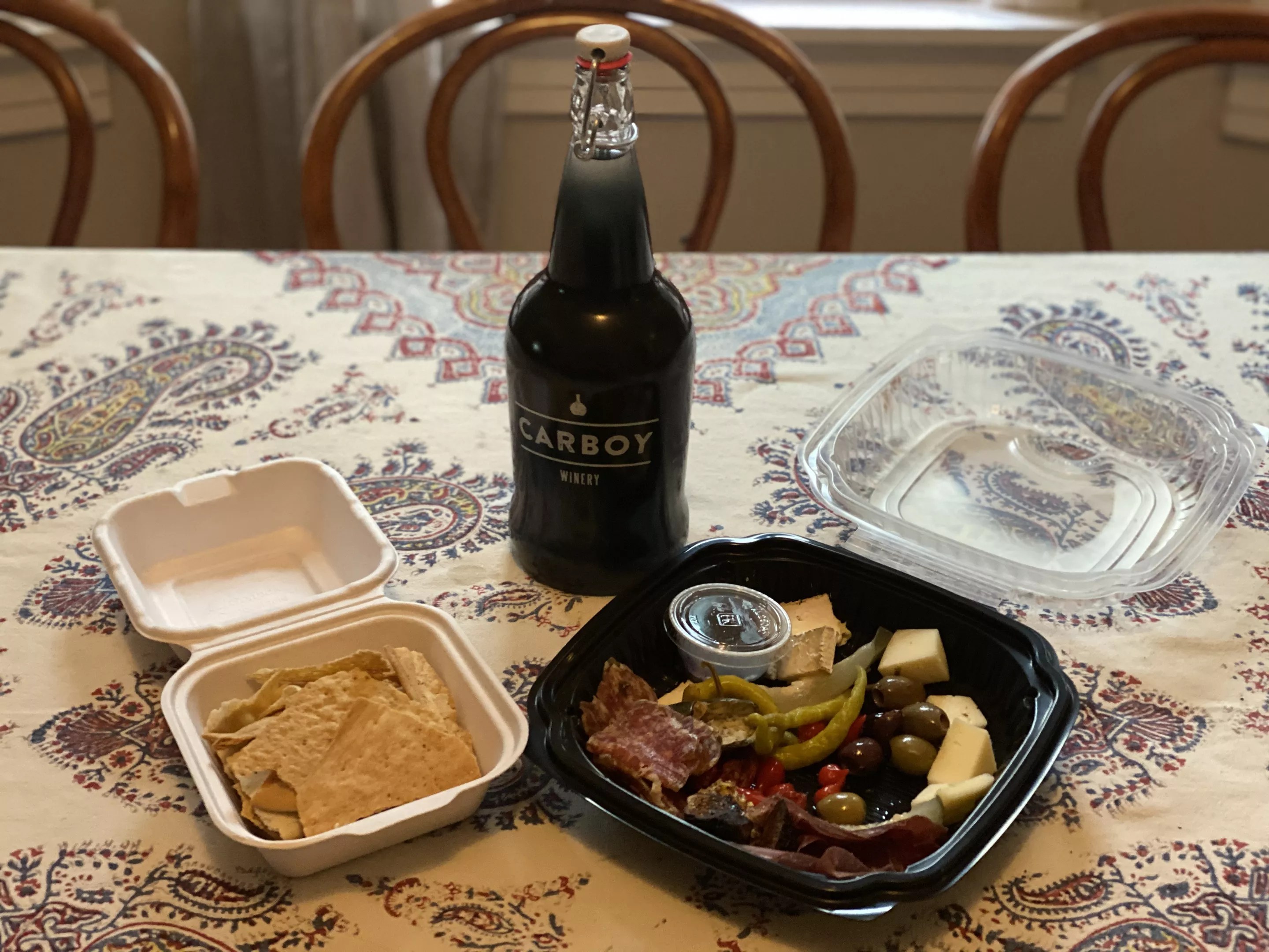 I went straight home and asked Pickles, my canine companion, how she felt about frozen treats, and she agreed it would be worth riding in my bike’s panier if I fulfill the promise. Carboy has a number of curbside pick-up offerings, including a board-and-bottle takeout special that, for $30 (plus $7 if you need to buy a refillable carafe), will get you a charcuterie board of your choice and a liter of house white or red. The wine bar is also giving away one free bottle when you buy a sixer, or two if you order a case. Since I knew my pup was getting an edible treat, I decided I needed something to go with my $5 wine, so I looked to the board-and-bottle specials, settling on the Andre the Giant combo, described as “a selection of domestic and imported charcuterie, preserves, pickles,” which, given the two other options – the Summer of 92 (all cheese, no meat) and the Red Rocker (two cheeses and two meats) – implied that it would be all meats and no cheeses.