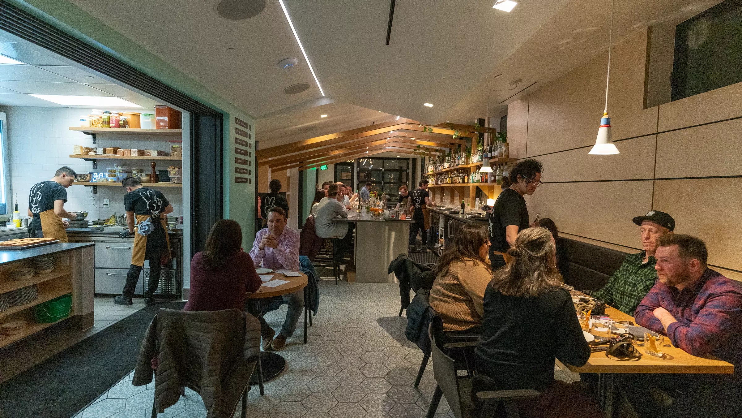 You can opt to start with chicken-liver mousse and Texas toast before digging into a half lobster with kosho butter alongside bucatini with fermented black-bean paste. Or snack on a serving of Korean popcorn chicken and milk rolls with cultured butter – or perhaps caviar and skin-contact wine is more your mood. Beyond the printed menu, rotating specials boards are also central to the concept. “It’s fun being in a space where we can just rip through food again,” Whitaker adds.