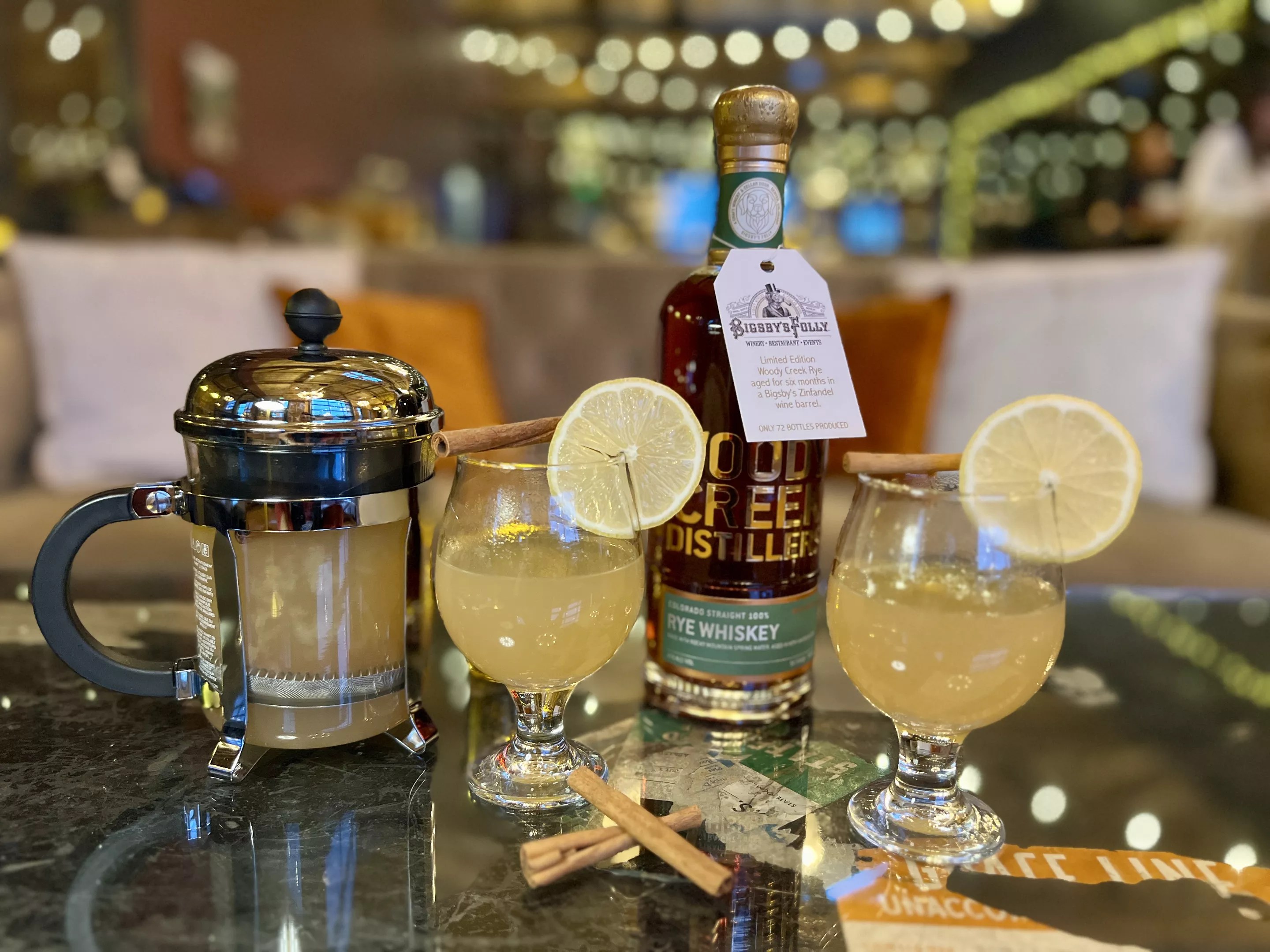 There are two warm cocktails available at Bigsy’s Folly this season. The hot toddy is made with Redemption Bourbon, but you can substitute a local collaboration Woody Creek Rye that was aged for six months in one of the winery’s Zinfandel barrels. The hot mulled wine is made with a blend of Bigsby’s Cabernet Sauvignon, Zinfandel and Cabernet Franc along with brandy, pomegranate, cranberry, orange and mulling spices.