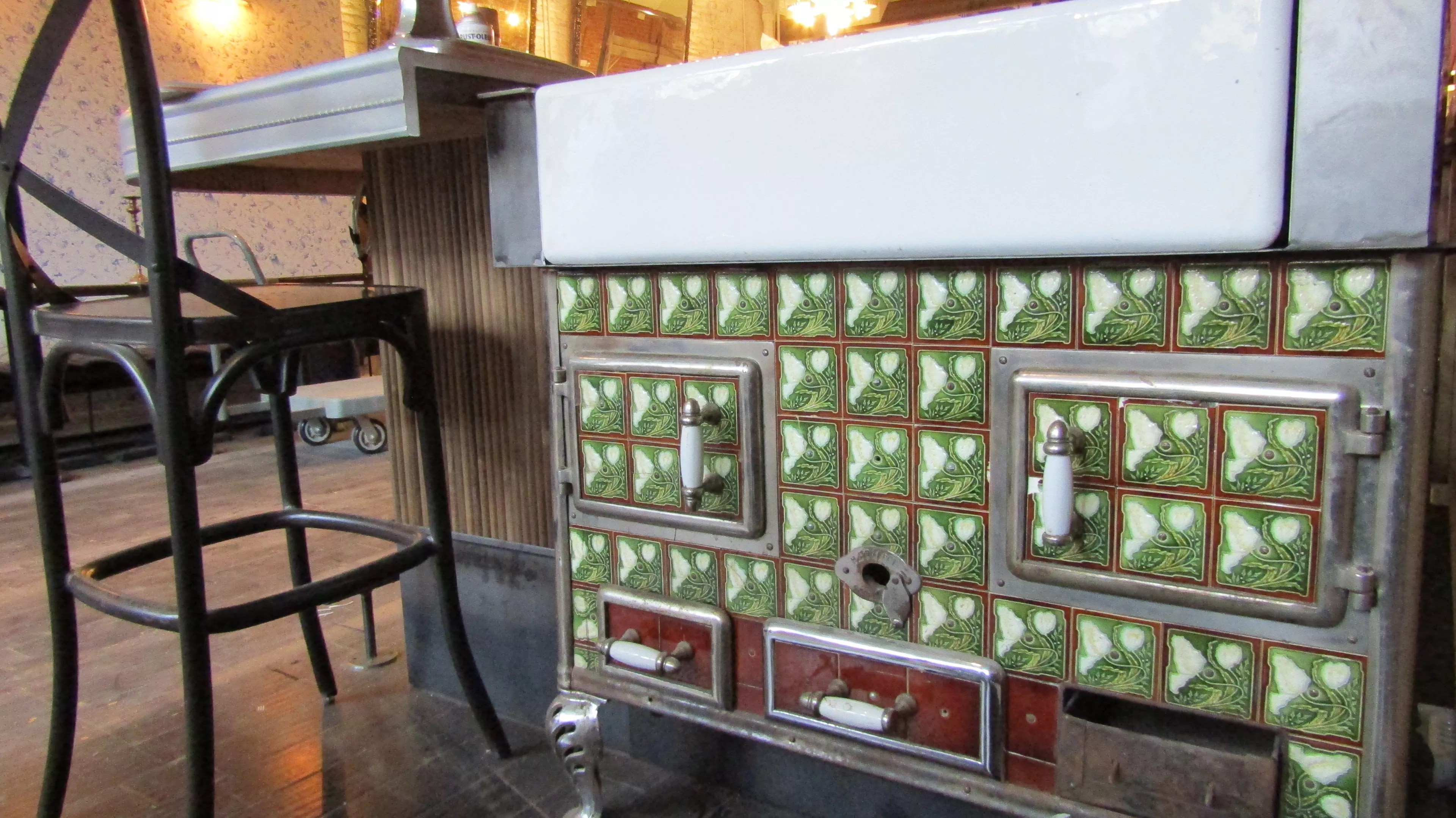 The bar and kitchen pass also include antique elements; Jake salvaged wooden icebox doors from his grandmother’s farm in Indiana and found an old Italian stove covered in green tile. While exploring the basement below the restaurant, he discovered that the building had once been a tobacco shop and cigar factory, so he used some of that history for inspiration too. Brass light fixtures that were once gas lamps were salvaged from the remodel of the Hotel Teatro four years ago, and an enormous bronze mirror frame behind the bar is actually a salvaged billboard box that held stage and movie posters at one of Denver’s original theaters.