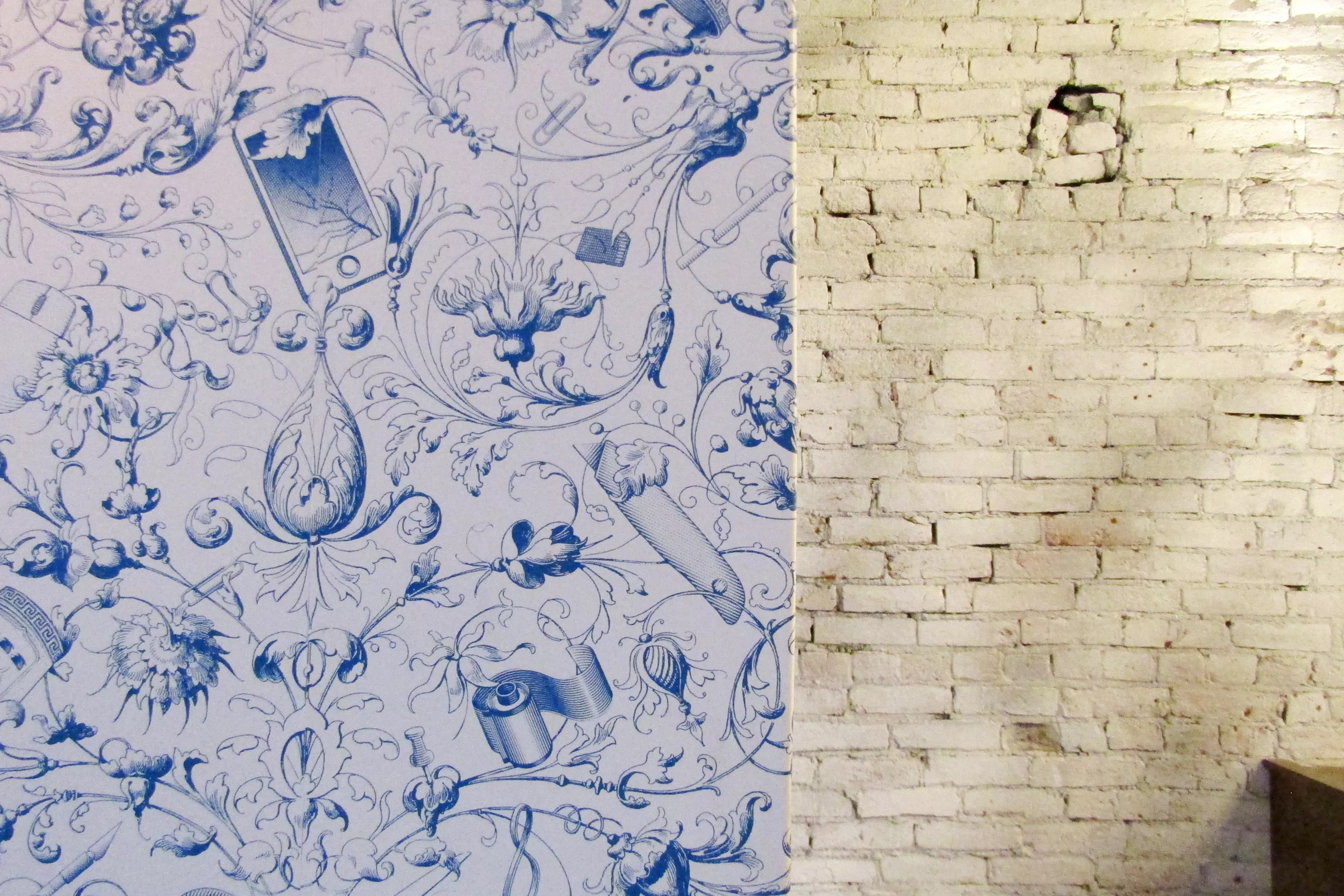 Other more modern elements add a touch of whimsy, from a Vespa scooter remade into a host station to wallpaper from Walltawk, a Denver-based design company. The entryway wall is covered in blue and white wallpaper with what appears to be a floral pattern, but closer inspection reveals iPhones an other contemporary elements hidden among the flowers and leaves. More wallpaper covered in images of hands holding mirrors (which have actual reflective surfaces) decorates a stairwell leading to a wine cellar that will soon become the “Soto Vocce” room, a subterranean lounge for wine lovers.