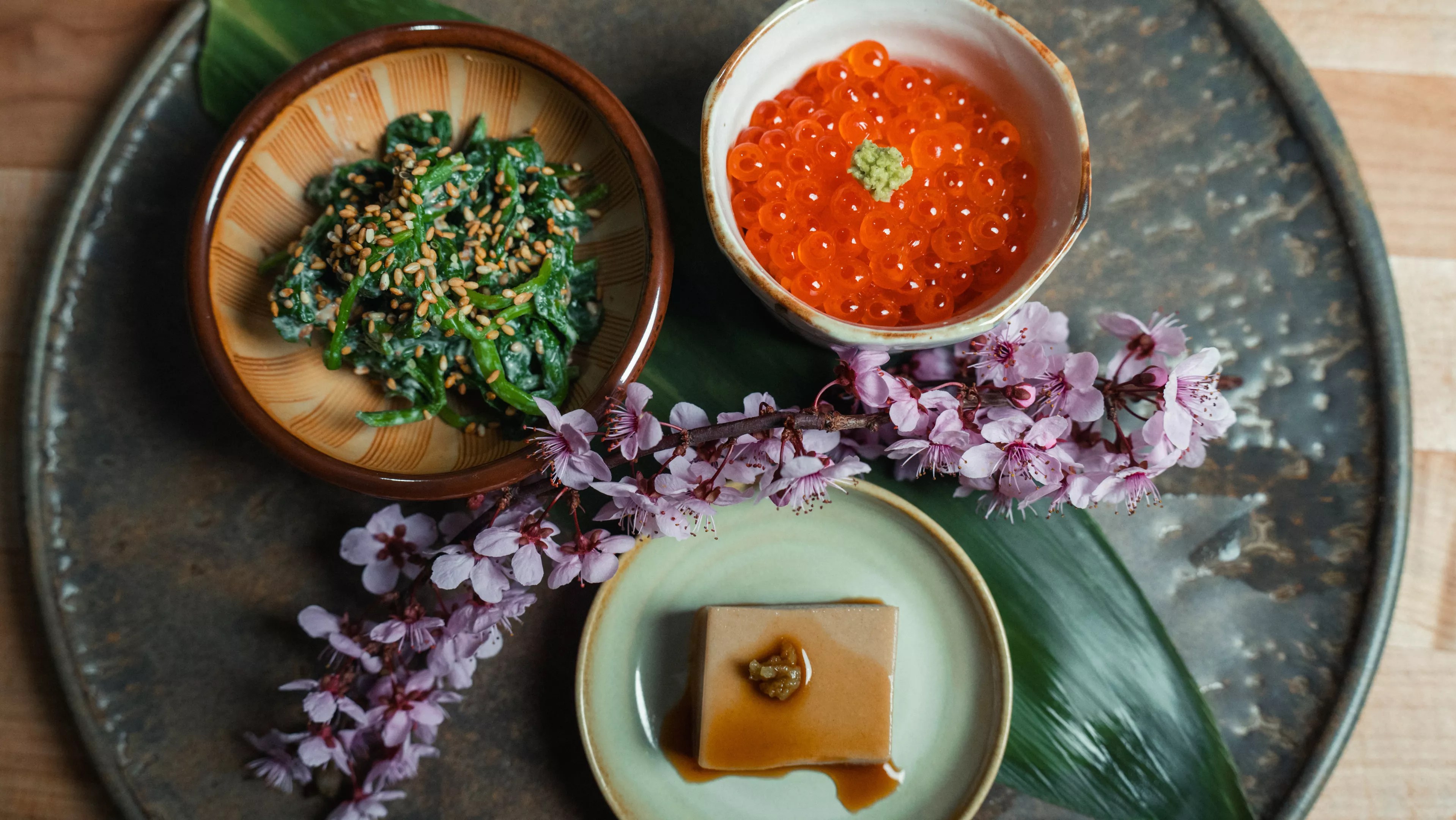 Sampler starter: bloomsdale spinach salad, rice topped with salmon roe, and sesame tofu made with sesame paste and arrowroot powder