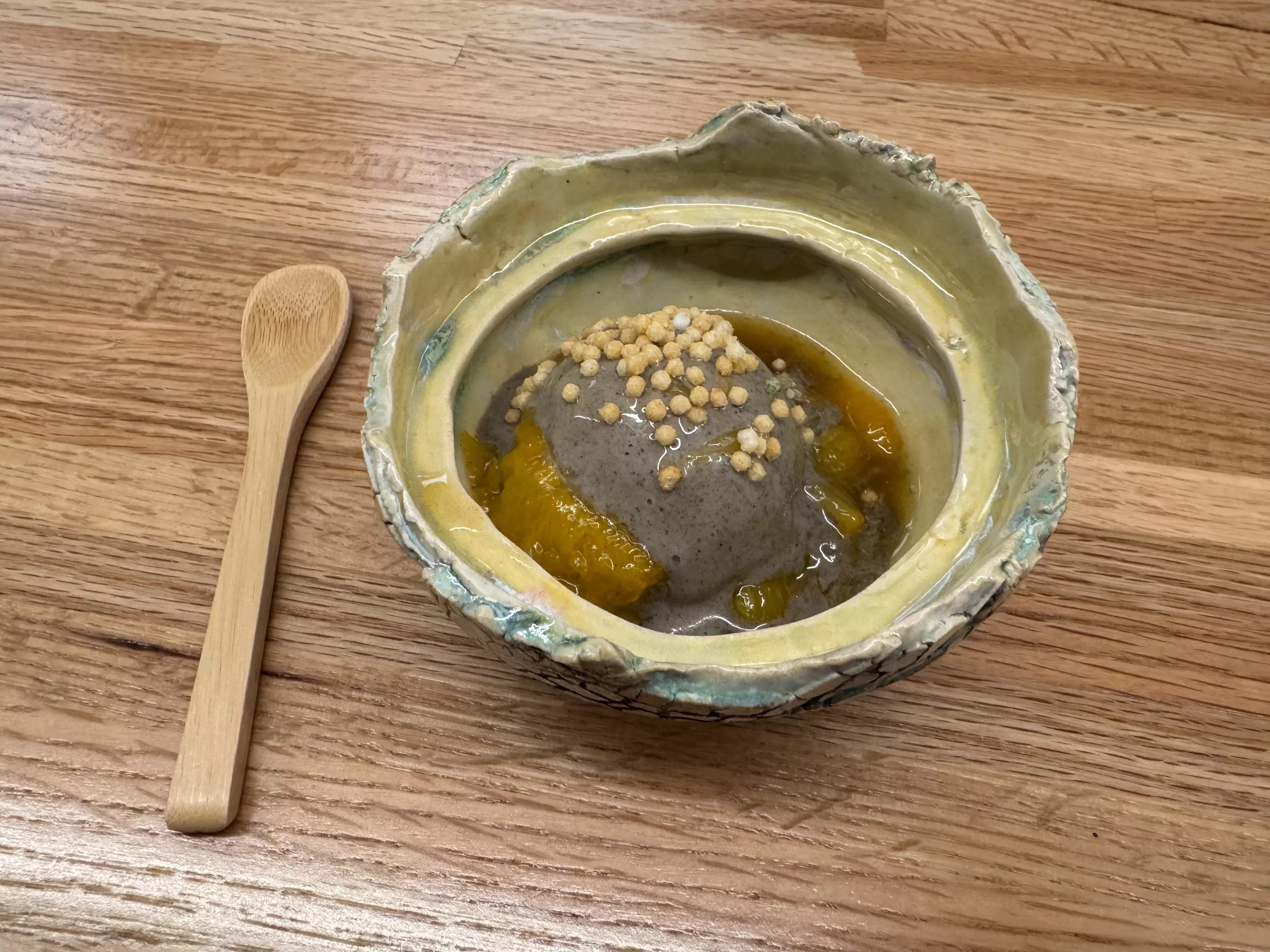 In other cases, the plateware complements the aesthetics of the dish. The bowl holding the homey, nourishing steamed red sea bream dashi soup had a mottled finish, with an interior glaze in glossy oxblood that contrasted with the milky white of the broth and fresh green of the garnish. Then there are courses where the plates are just plain fun. “We specifically wanted it to look like a cracked dragon egg,” says Odell of the plate for the dessert course, which has an uneven seafoam-green glaze across the surface with hints of pale yellow and soft turquoise peeking through. When the dish is served, the top of the egg is lifted off by the chef, revealing a mochi cake, topped with black sesame ice cream and flambeed orange.
