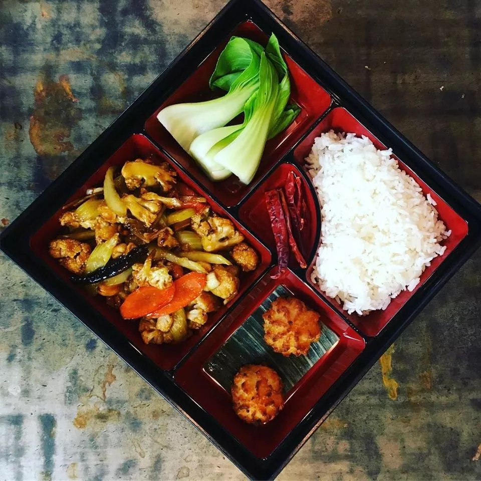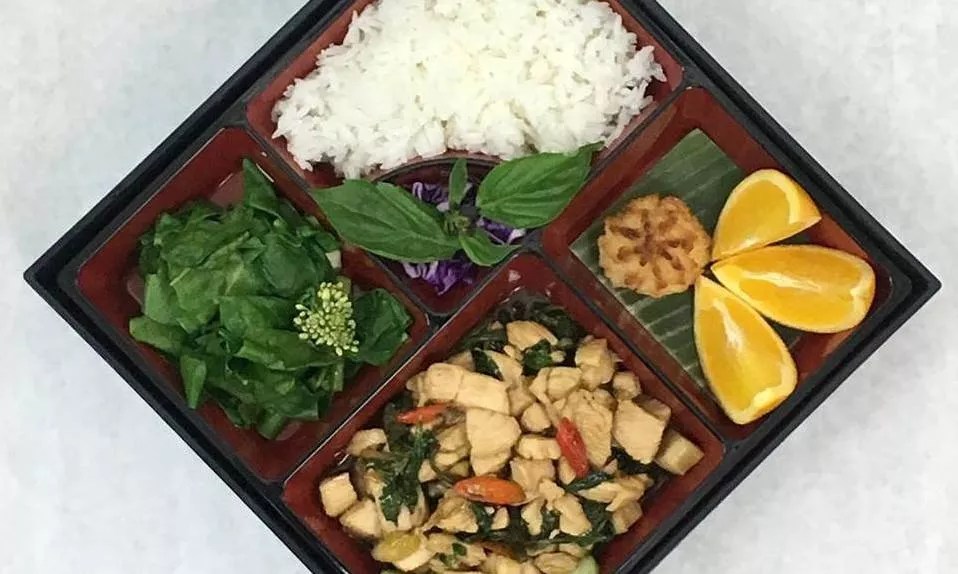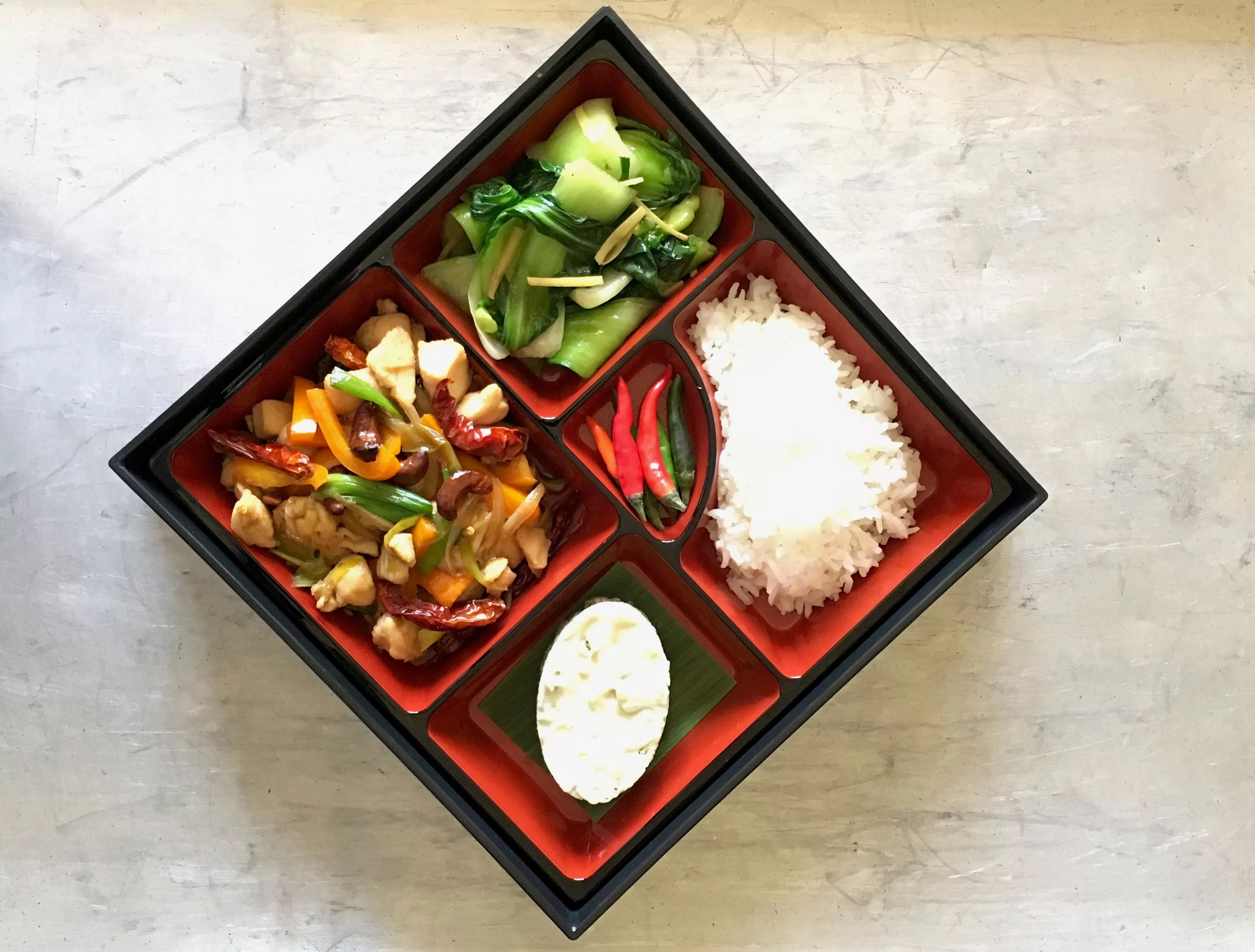 Like those Japanese delivery services, Kelley uses real bento boxes, so food arrives compartmentalized and ready to eat, and the trays are picked up after lunch. But the food goes beyond Japanese cuisine; Thai, Korean, Vietnamese and American-Chinese (Kelley says his kung pao cauliflower is a big seller, even if it’s not something he picked up on his travels) are available on the regular menu, and weekly specials like Thai-style cashew chicken or upcoming chirashi sushi bentos will be available, mostly in a range of $14 to $16. Each box is a complete meal (including dessert), but additional sides like spring rolls and kimchi fried rice are also offered.
