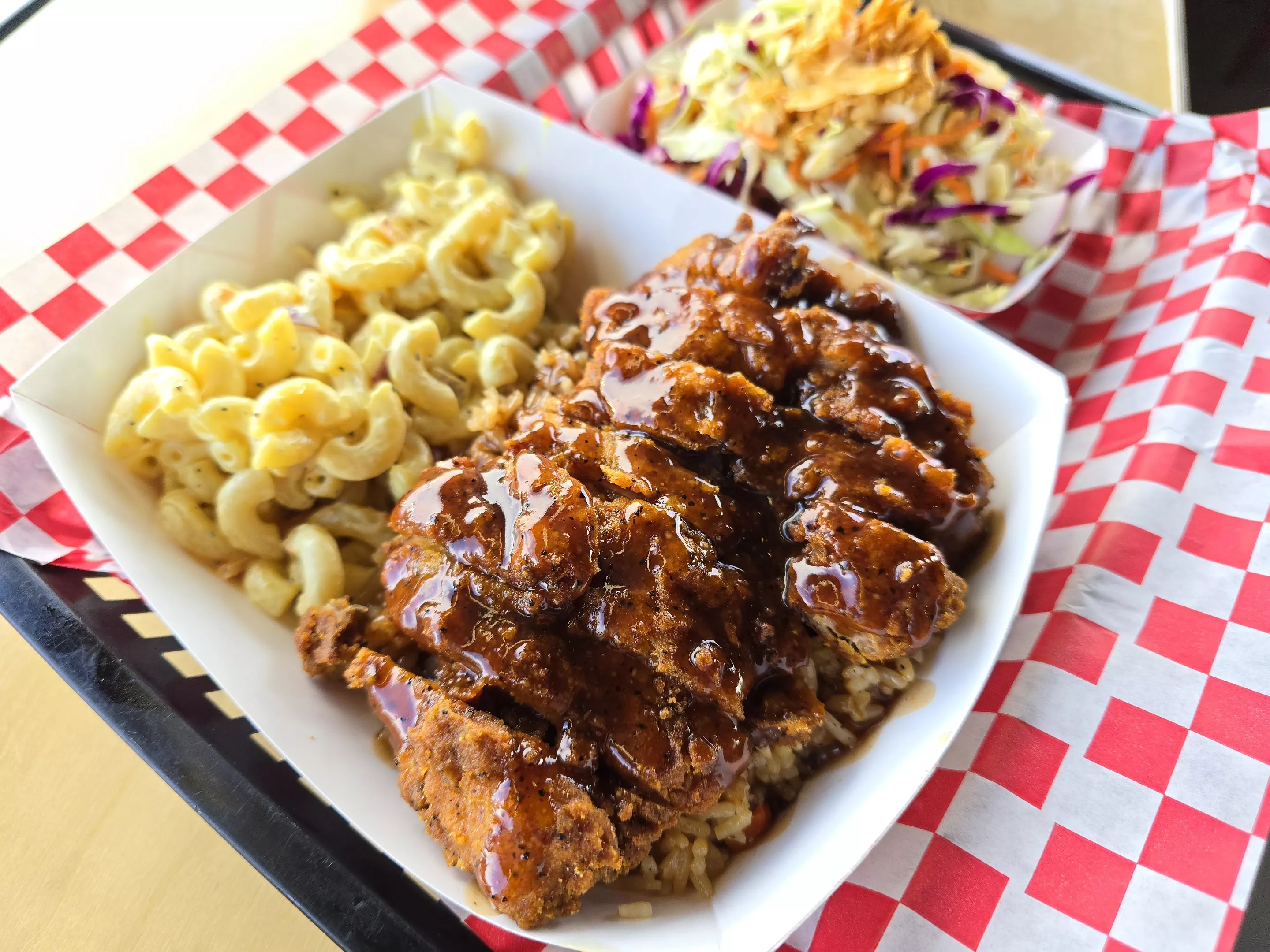 The lineup includes four entrees all priced under $14: three chicken tenders with a choice of two dipping sauces; a chicken sandwich made with a fried chicken thigh, sauce and slaw on Texas toast; chicken tenders with a cheddar jalapeño bubble waffle; and chicken katsu over fried rice with mac salad. “They’re all pretty equally popular,” says Ivy. “I think there’s something for everybody here.”
