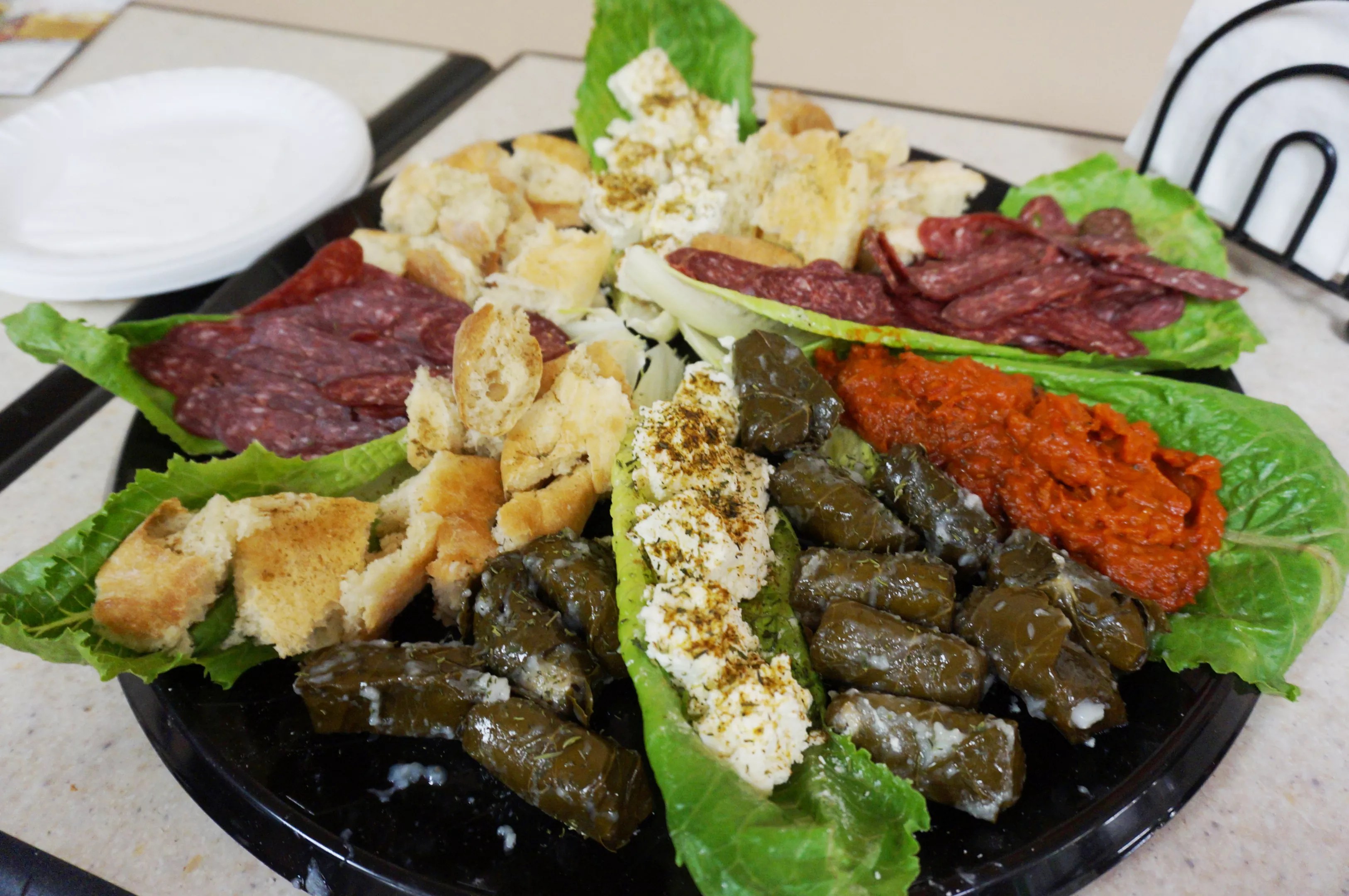A sampler platter of Balkan foods available at European Market: lukanka sausage, locally baked bread, Bulgarian feta cheese sprinkled with herbs, dolmades and bright orange ajvar.