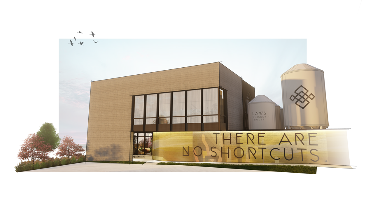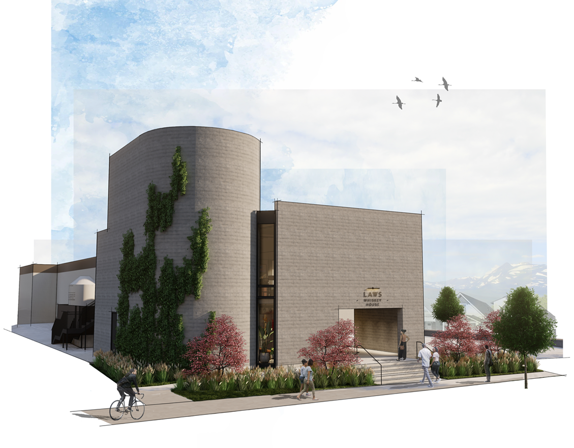 A rendering shows an exterior view of the revamped Laws distillery and tasting room.