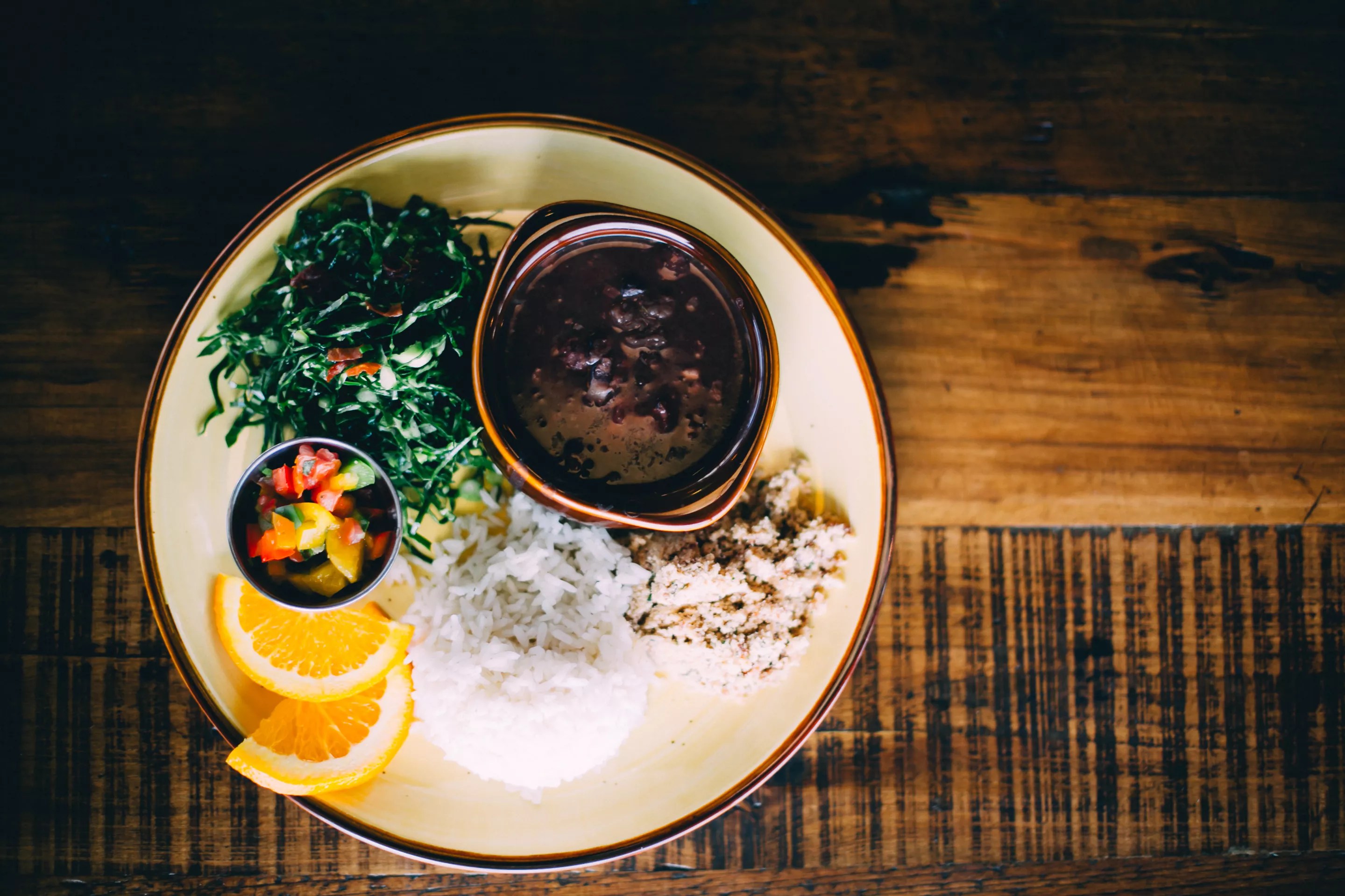 Feijoada, a black bean stew with smoked sausage, pork tenderloin, cured beef, and bacon, served with rice, collard greens, yucca flour garnish, and fresh orange slices.