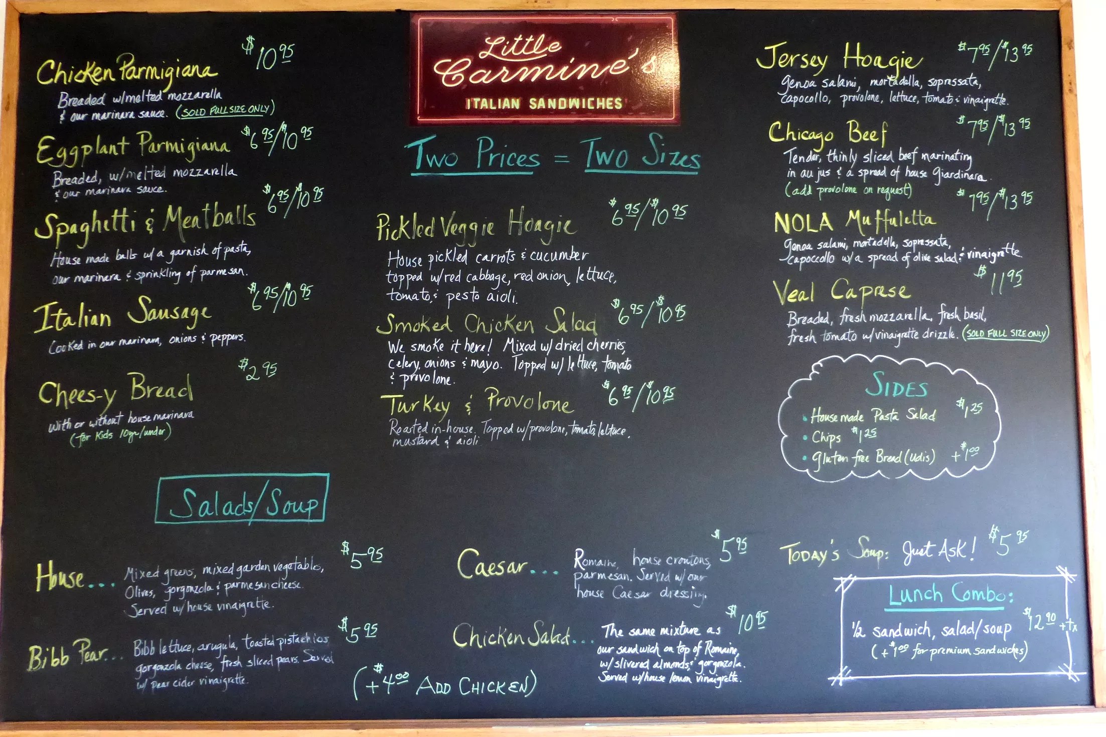 The muffuletta would not be on the menu at Little Carmine’s unless the olive salad had first been perfected. The recipe here was created by Joe Hubbard, who previously worked as a chef in New Orleans. Recently retired, Hubbard has rolled up his knives and now spends his time trout fishing, but his culinary legacy lives on in the kitchen and on the menu board.
