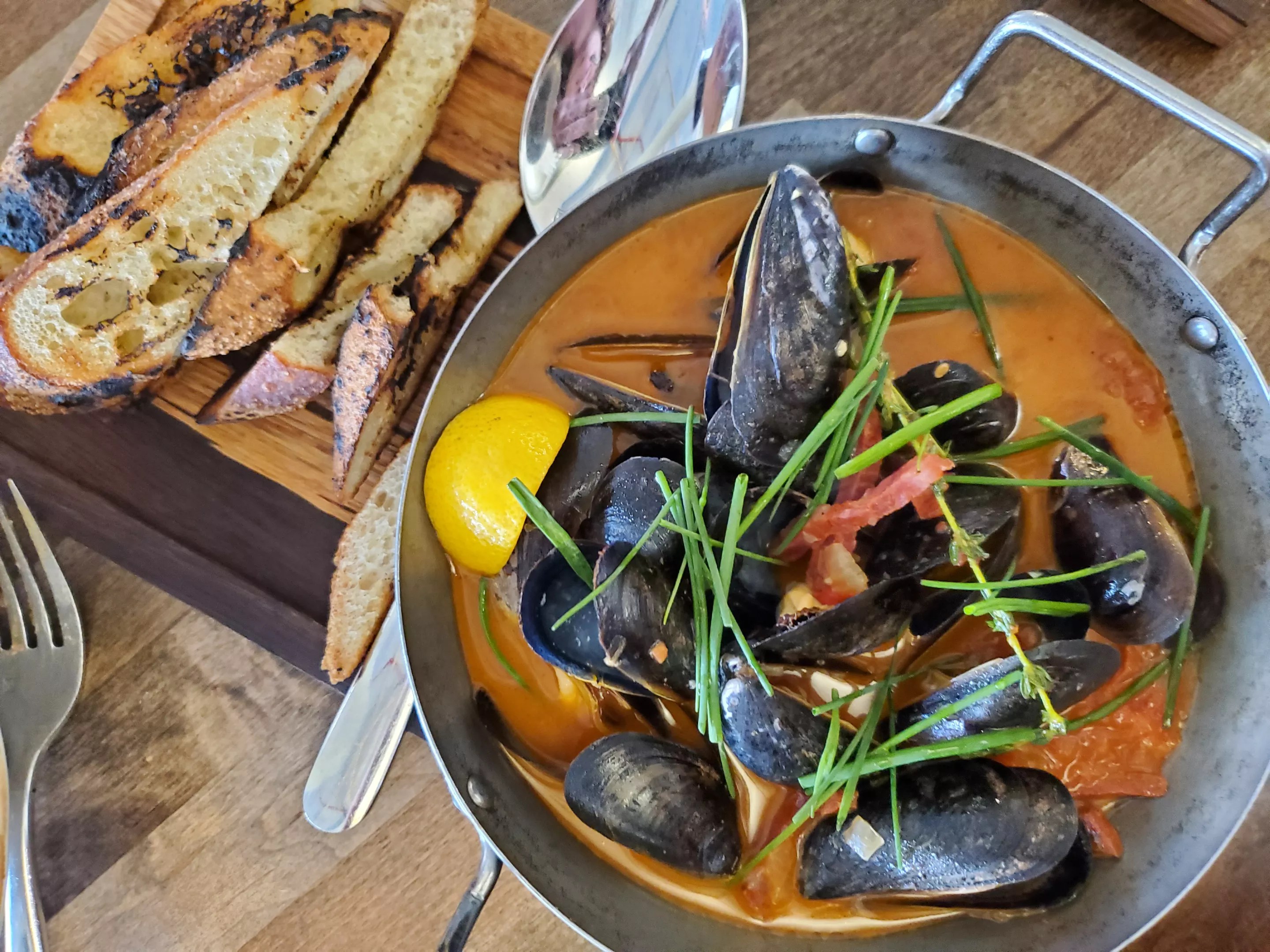 Mussels are served in a broth studded with tomatoes and chorizo.