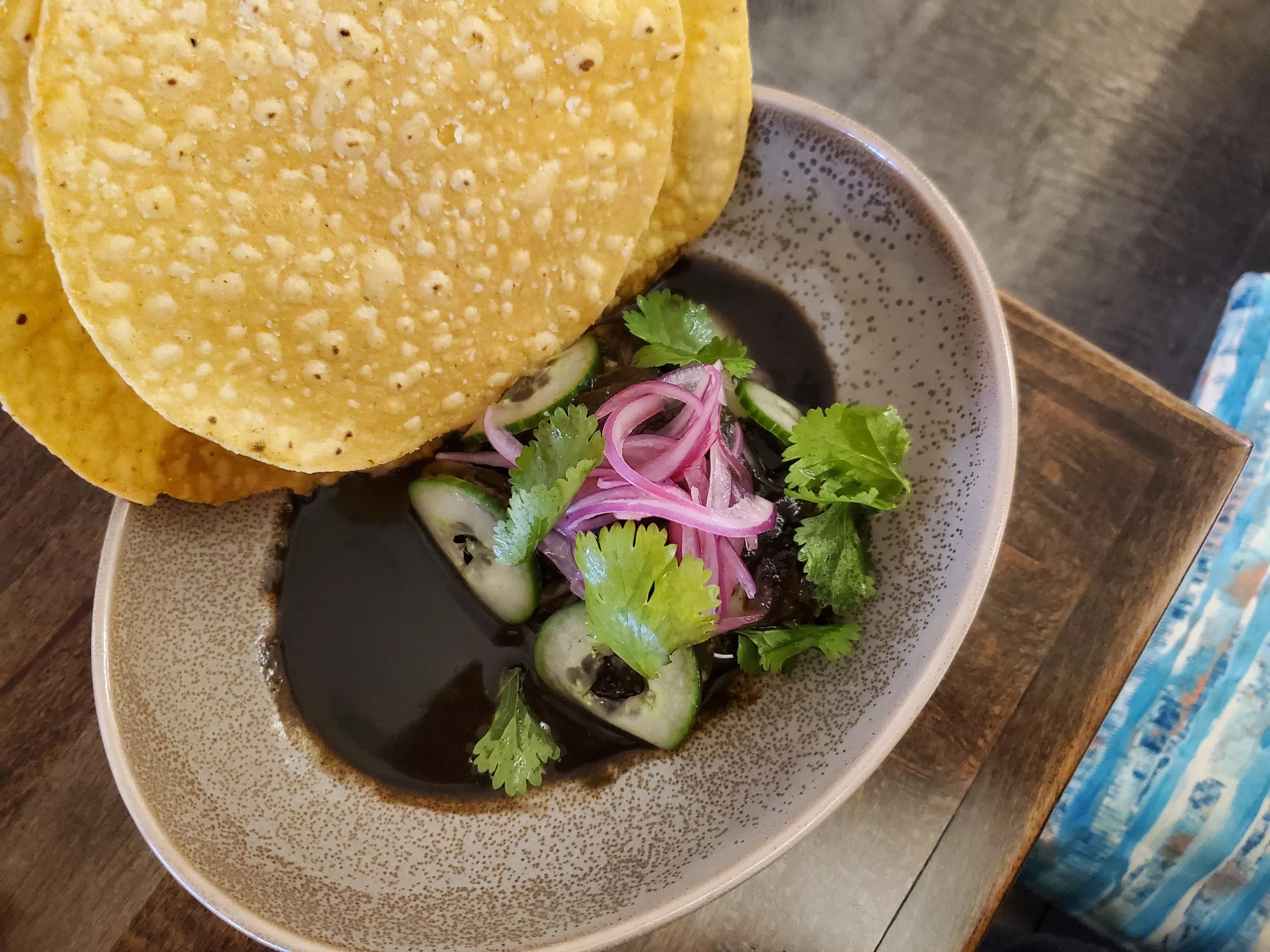 The last item, agua chile negro ($18), with whole shrimp swimming in its dark depths, is one that Casiano was inspired to add to the menu following a recent trip to Mexico. Despite the pitch-black hue of the liquid, the dish is bright and citrusy.