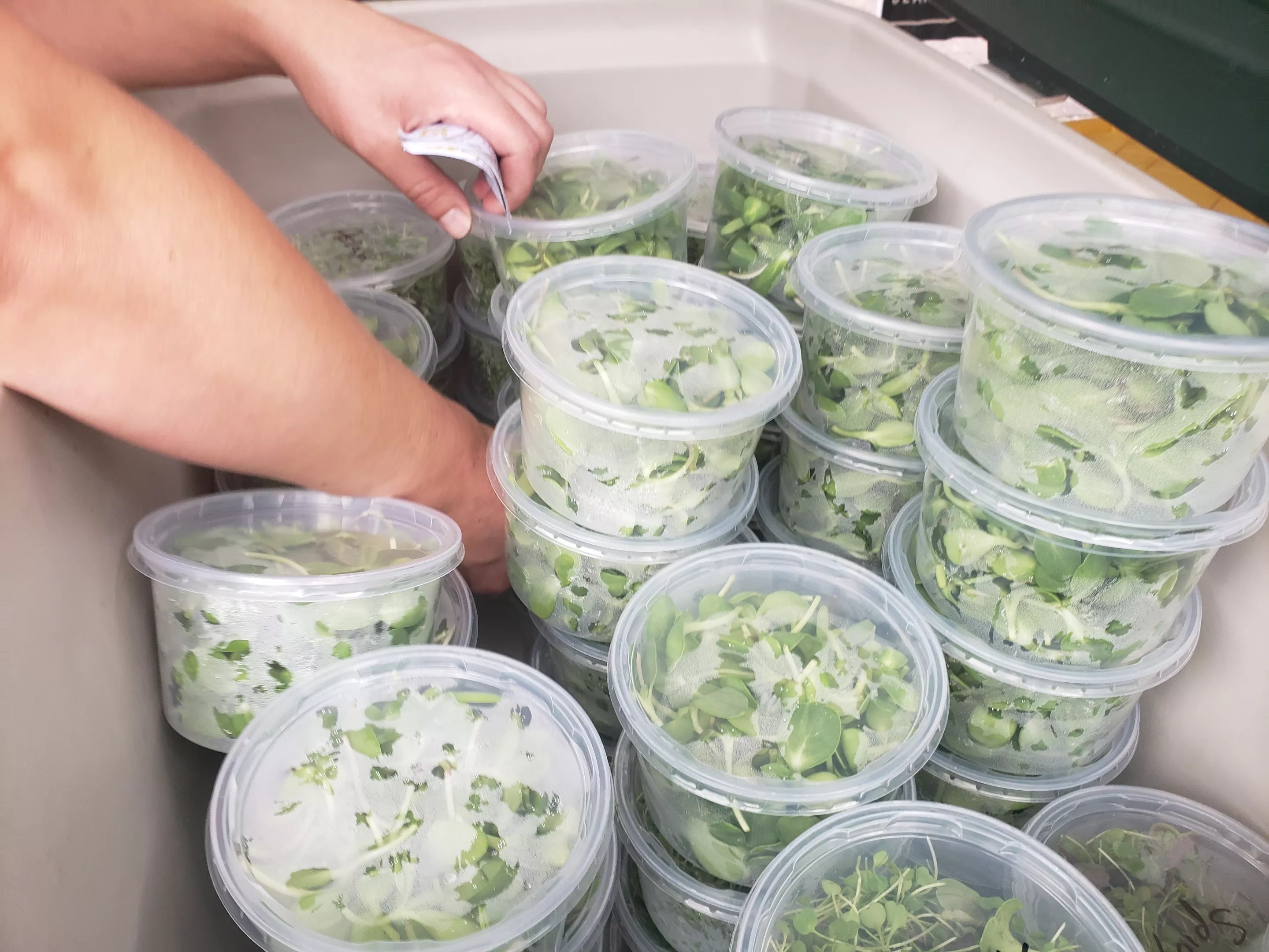 Donovan hunts for sunflower shoots from Ollin Farms.