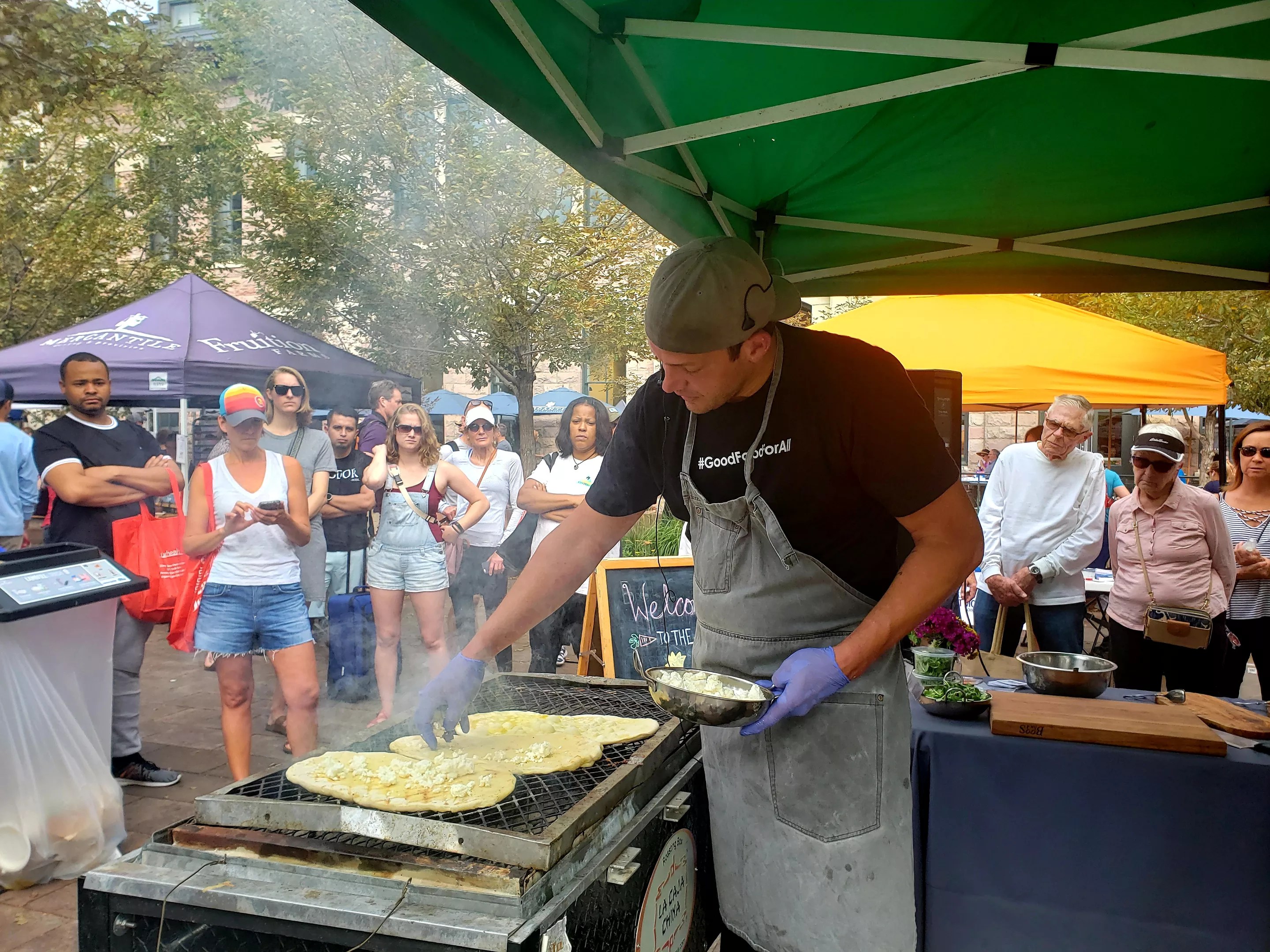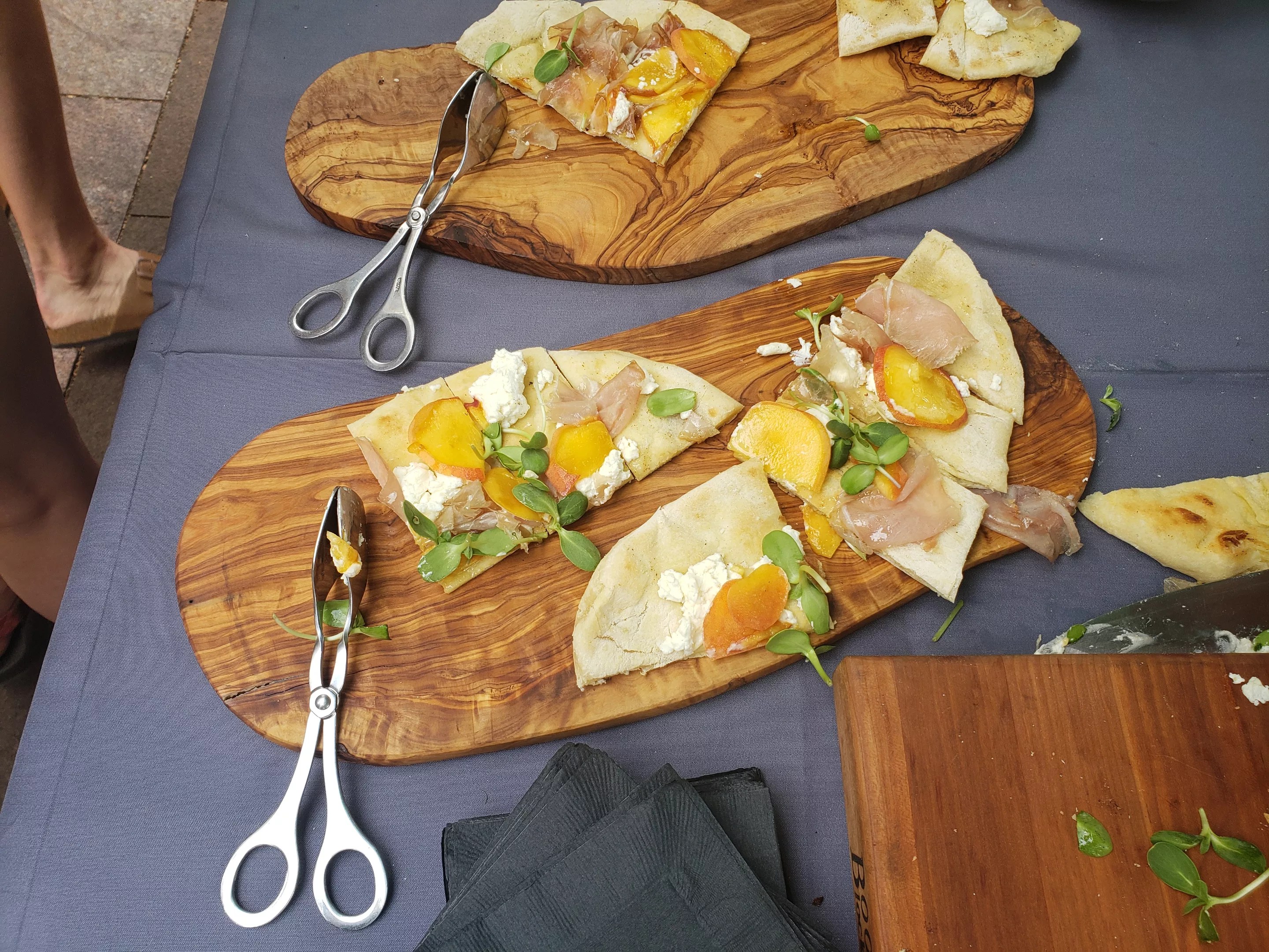 To give the savory flatbread a little more sweetness, Kayser drizzled wildflower honey from Highland Honey onto the bubbling bread. Then came the cheese, and finally the peach slices were scattered on top. After removing the flatbreads from the grill, the chefs added emerald green sunflower shoots purchased from Ollin Farms for some bright crunch. As the two chefs teamed up to make this simple yet showy dish, a crowd quickly formed, staying a good distance from the smoky grill.